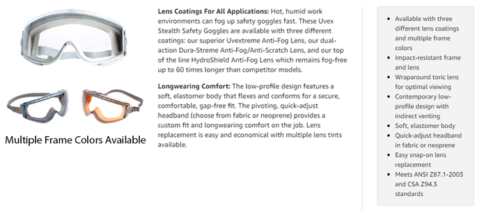 Never before have goggles offered such comfort and protection as well as sleek, futuristic styling. The Uvex Stealth goggle combines modern design, technology, materials and high performance lens coatings to create the highest levels of worker comfort and acceptance. The Uvex Stealth makes it easy, and even fashionable, to wear goggles on the job.