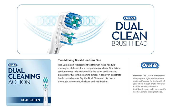 Two Moving Brush Heads in One. The Dual Clean toothbrush head features twice the cleaning action thanks to two moving brush heads in one. It delivers a thorough cleaning to remove plaque, freshen and provide gum care. The Dual Clean works with unique Oral-B technology that oscillates, rotates and pulsates, allowing the bristles to surround each tooth for an amazing, tooth-by-tooth clean.