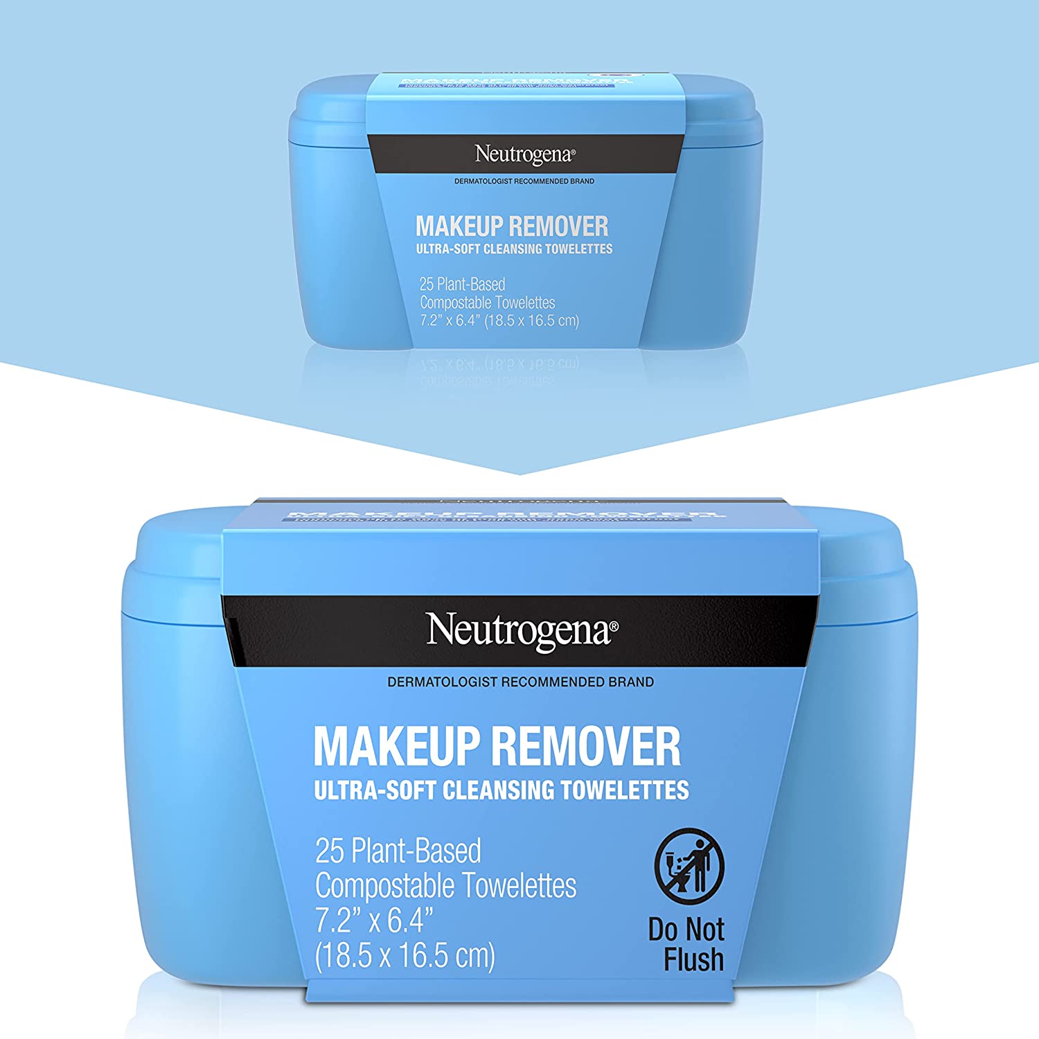 Neutrogena Makeup Remover Facial Cleansing Towelettes, Daily Face Wipes Remove Dirt, Oil, Sweat, Makeup & Waterproof Mascara, Gentle, Soap- & Alcohol-Free, 100% Plant-Based Cloth, 25 ct