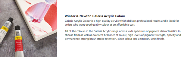 Winsor & Newton Galleria Acrylic Color is a high quality acrylic which delivers professional results and is ideal for artists who want good quality color at an affordable price. All of the colors in the Galleria Acrylic range offer a wide spectrum of pigment characteristics to choose from as well as excellent brilliance of color, high levels of pigment strength, opacity & permanence, strong brush stroke retention, clean color and a smooth, satin finish.