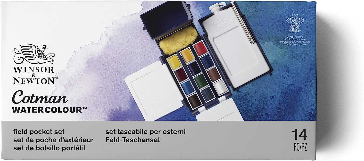 Winsor & Newton Cotman Water Colors are a range of water colors that are made to our normal high quality standards but costs are kept to an economical level by replacing some of the more costly pigments with less expensive alternatives. Each color has good transparency, excellent tinting strength and good working properties. This exclusive compact Field Box has been designed to be light-weight and fit snugly into the pocket while providing everything required for successful outdoor water color painting. Constructed in durable blue plastic, the Field Box includes: 12 Cotman Water Color half pans, a pocket brush, artists' sponge, 3 mixing areas, 35ml capacity water bottle, clip-on water container and an instructional leaflet. Colors included: Cadmium Red Pale Hue, Cadmium Yellow Hue, Cadmium Yellow Pale Hue, Alizarin Crimson Hue, Ultramarine, Cobalt Blue Hue, Sap Green, Viridian Hue, Burnt Umber, Yellow Ochre, Burnt Sienna and Chinese White.