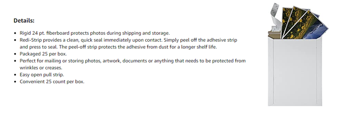 Extra-rigid fiberboard mailer protects photos and documents. No more bent photos -- rigid fiberboard backing resists bending so photos arrive at their destination in pristine condition. Features Redi-Strip for convenient closure and a tear strip for easy opening.