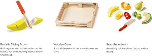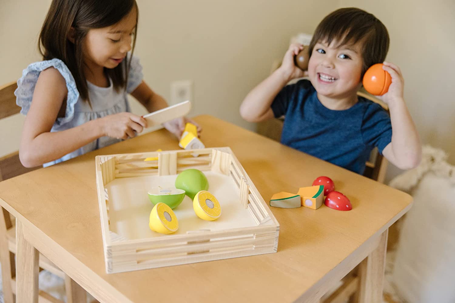 This wooden play food set features a wooden knife and seven pieces of sliceable fruit that can be cut into a total of 17 pieces! Held together with self-stick tabs, the food makes a fun and satisfying crunch sound when sliced. With so many pieces, it’s also a great way to introduce counting and the concepts of part, whole, and fractions! This cutting fruit set for kids includes an attractive wooden crate that stores all the pieces for convenient travel and organization. The Cutting Fruit Set is an ideal gift for kids ages 3 to 5 years. Add the Melissa & Doug Play Time Produce Fruit Play Food to round out the pretend play experience and give kids an engaging option for screen-free fun. This wooden play set measures 2.75″ H × 9″ W × 9″ L and weighs 2.35 pounds. For more than 30 years, Melissa & Doug has created beautifully designed imagination- and creativity-sparking products that NBC News called “the gold standard in early childhood play.” Today, Melissa & Doug is proudly partnering with the American Academy of Pediatrics to foster early brain development and help children build important life skills through play.