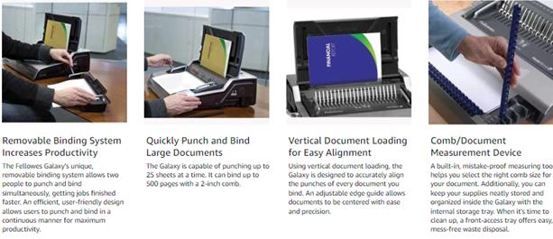 The high performance Fellowes Galaxy E Comb Binding Machine features effortless electric operation for large offices. Punches up to 25 sheets at the touch of a button and binds up to 500 sheets with a 2 Inches comb. Vertical document loading ensures accurate punch alignment. Removable binding mechanism can be used separately for increased productivity. Releasable dies for different document sizes. Features built-in comb storage tray with integrated document measurement device for added convenience and quick set-up. Adjustable edge guide centers documents with ease. Includes front-access waste tray and binding starter pack (contents: 20 pack assorted kit).