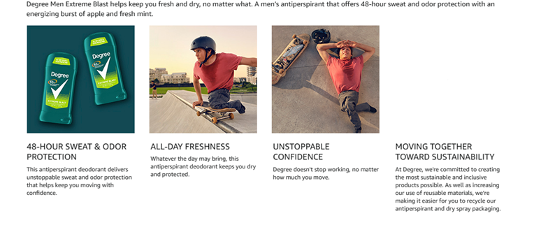 - GO BEYOND YOUR LIMITS: At Degree, we want to inspire the confidence in everyone to move more and go further. We’re here to support your journey through an antiperspirant that moves with you