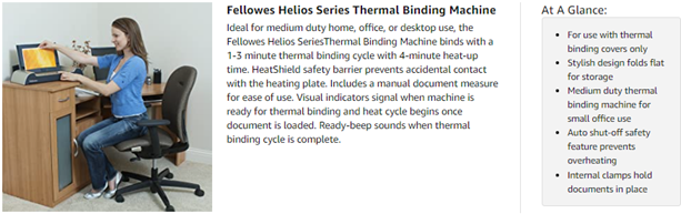 Ideal for frequent use in large offices, the Fellowes Helios 60 Thermal Binding Machine features an auto document thickness detector with auto-binding cycle that selects thermal binding settings for the user. Binds documents up to 600 sheets in a single step. 1-3 minute thermal binding cycle with 4-minute heat-up time. Heat Shield safety barrier prevents accidental contact with the heating plate. Visual indicators signal when machine is ready for thermal binding and heat cycle begins once document is loaded. Ready-beep sounds when thermal binding cycle is complete. Internal clamps hold documents in place during thermal binding process. Auto shut-off safety feature prevents overheating. Stylish design folds flat for storage. For use with thermal binding covers only.
