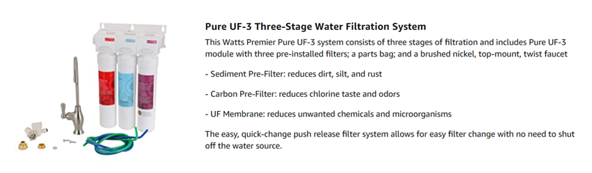 The Watts UF-3 filters drinking water in three stages. Once the system is connected, water from the tap passes through a five-micron sediment filter, followed by a heavy-duty one-micron carbon block filter that reduces lead and chemicals.