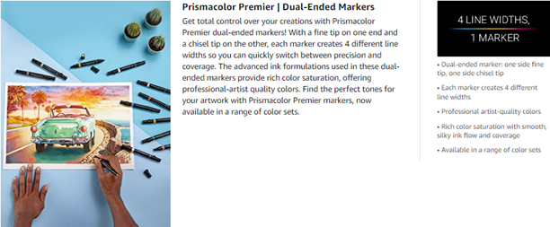 Lay down precisely the marks you want to make in 12 Manga-perfect colors with Prismacolor Premier Double-Ended Art Markers. The dual-ended design features a fine tip on one end and a large chisel on the other. This allows you to quickly flip between precision and coverage. The ink is richly saturated and designed for an effortlessly smooth flow while a single source of ink ensures color consistency at both ends. And the advanced, alcohol-based pigment resists fading so your creations will endure.