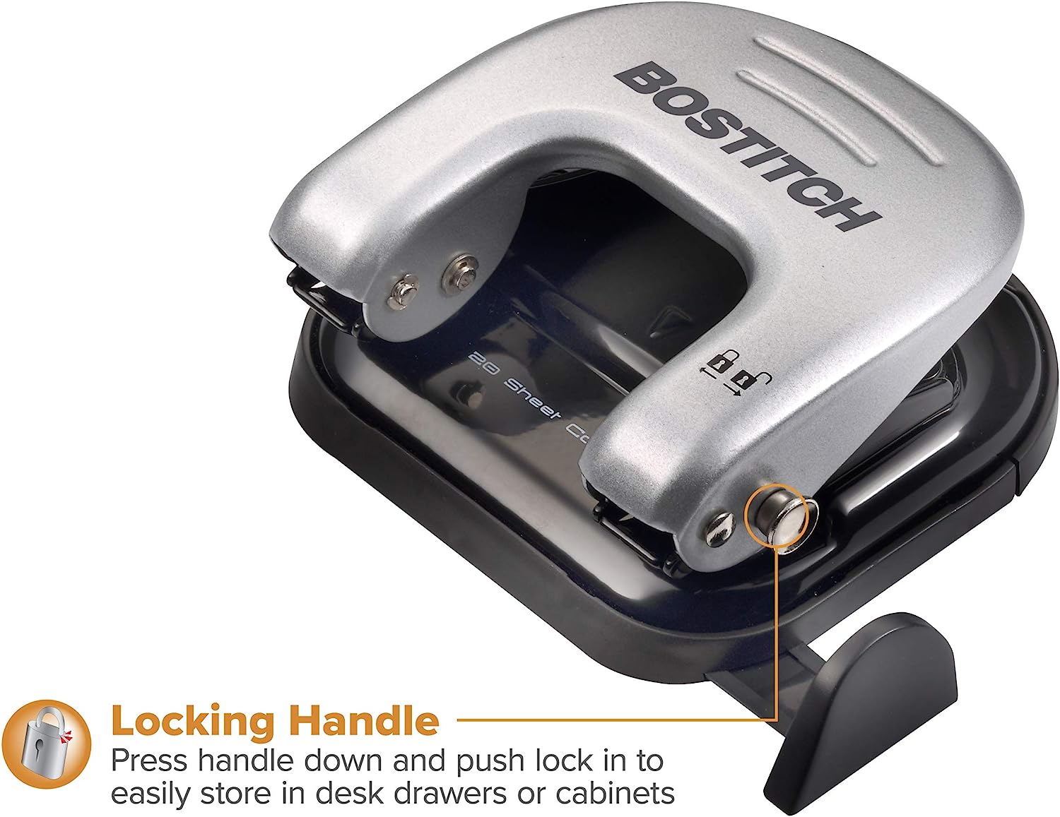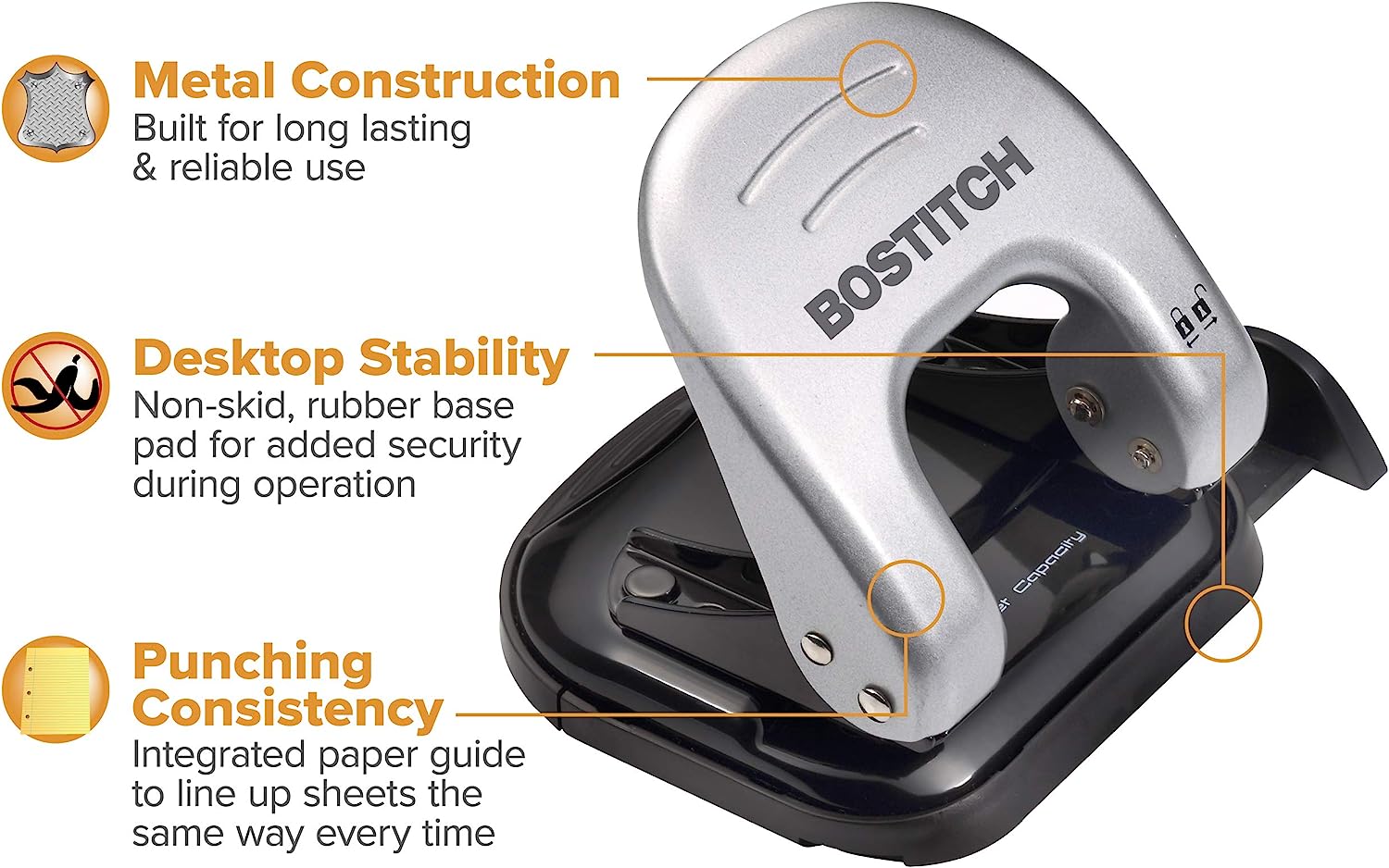 With this Bostitch two-hole punch built with PaperPro technology, easily punch up to 20 sheets, jam-free. Designed with sleek, comfortable curves and a durable all-metal design for long-lasting performance. To ensure consistent hole placement, the punch has an integrated paper guide and ruler. For maintaining a clean work environment, the base holds the chip waste and can be emptied through the flip-open door. Ideal for the home, office or school, this hole puncher is the perfect tool for any setting.