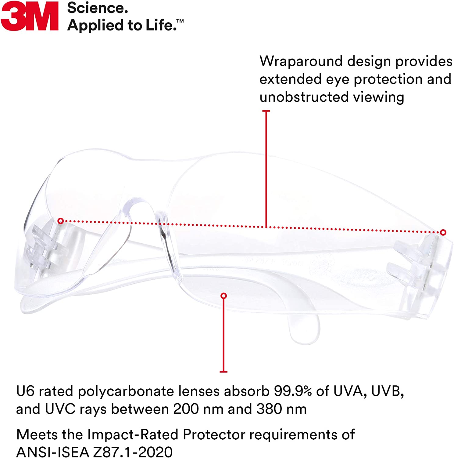 WRAP AROUND DESIGN provides extended eye protection and unobstructed viewing.
