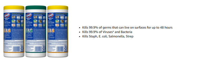 Clorox disinfecting wipes easily clean and disinfect most surfaces, such as acrylic, glass and vinyl. Premoistened wipes are ready to use and disposable after one use. Simply wipe and let sit for 30 seconds to sanitize or 4 minutes to disinfect. Thick textured wipes deliver a low-streak formula for use on shiny surfaces like glass and mirrors. Wipes kill 99.9 percent of germs including viruses that cause colds and flu (rhinovirus and influenza A2). Formula is effective against common bacteria such as staphylococcus aureus (staph.), salmonella enterica, and E. coli. Airtight canister package keeps wipes moist and dispenses wipes one at a time. Fresh and lemon fresh scent.