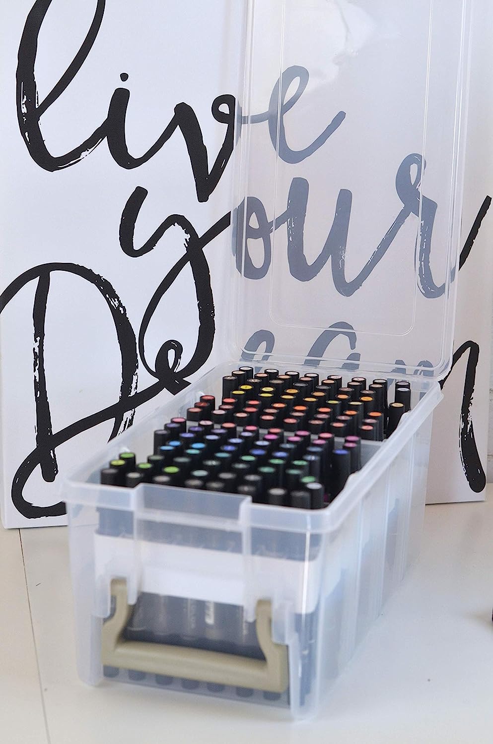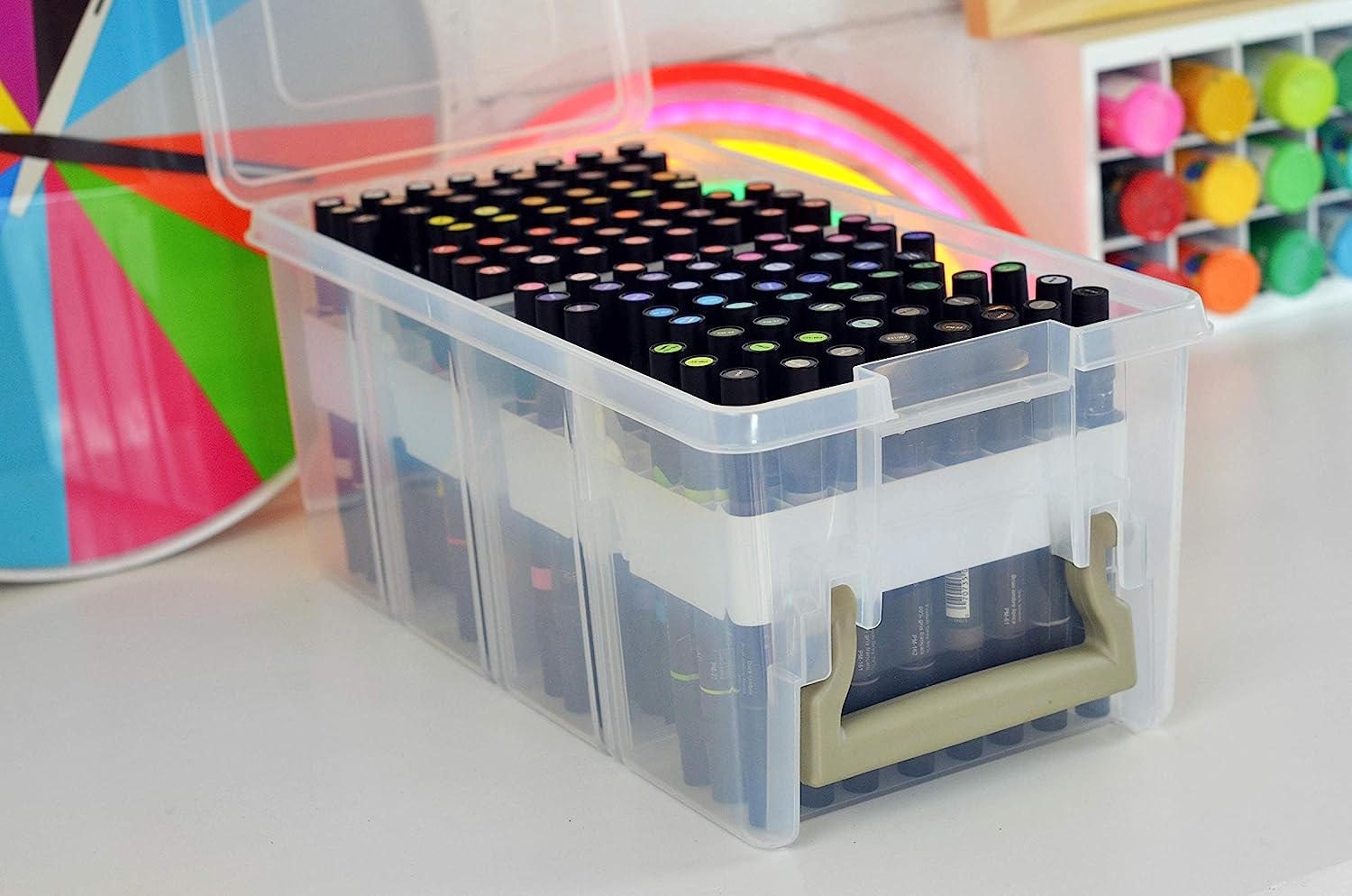 - Convenient Design: The ArtBin Marker Storage Satchel has a marker organizer tray with 64 small compartments for markers, paintbrushes, and more. The organized compartments of the tray allow you to quickly and easily see all of your supplies at once. No more digging through boxes of markers, pencils, and pens to find what you need!