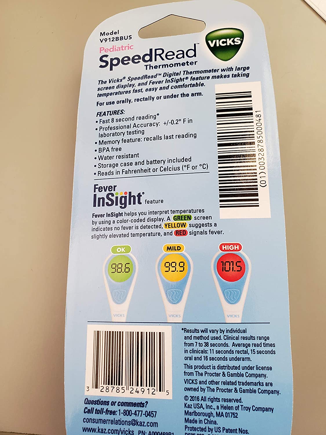 Vicks Speed Read Thermometer provides accurate readings in only 8 seconds. Unique Fever InSight uses color-coded displays to help you better understand the meaning of the reading. A green display suggests that there is no fever, yellow signifies a slightly elevated temperature and a red display indicates a fever. The V912US can be used orally, rectally or under the arm.