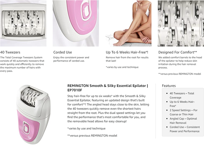 Remington Smooth & Silky Total Coverage Epilator, Electric Tweezing System, Pink, EP7010E