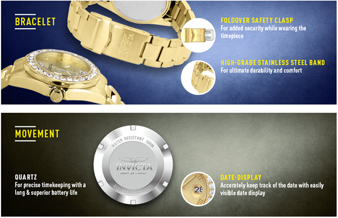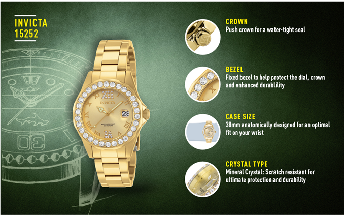 - Gold tone stainless steel case 38mm diameter x 12mm thick; Gold dial with 20 crystal accents; Luminous hands