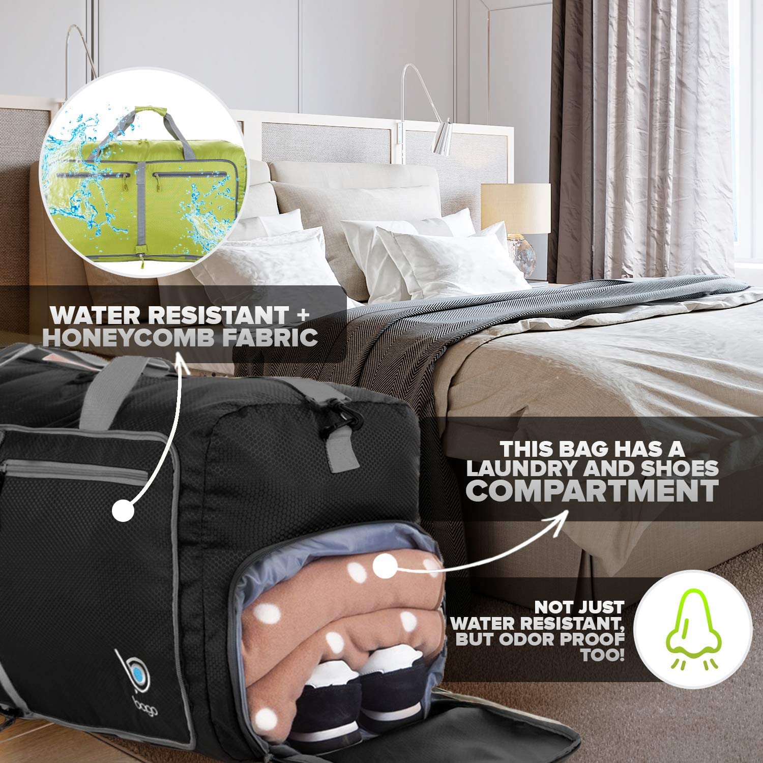 LARGE DUFFLE BAG FOR TRAVEL: 80L capacity, weighs 1.5 lbs, measures 11" x 15" x 27", folds to 12.6" x 11.8" x 1.5. Use as main luggage, weekender bag, sports gear storage, camping bag, extra shopping bag or even as hospital bag. Weighs 75% less than luggage!