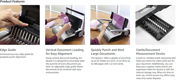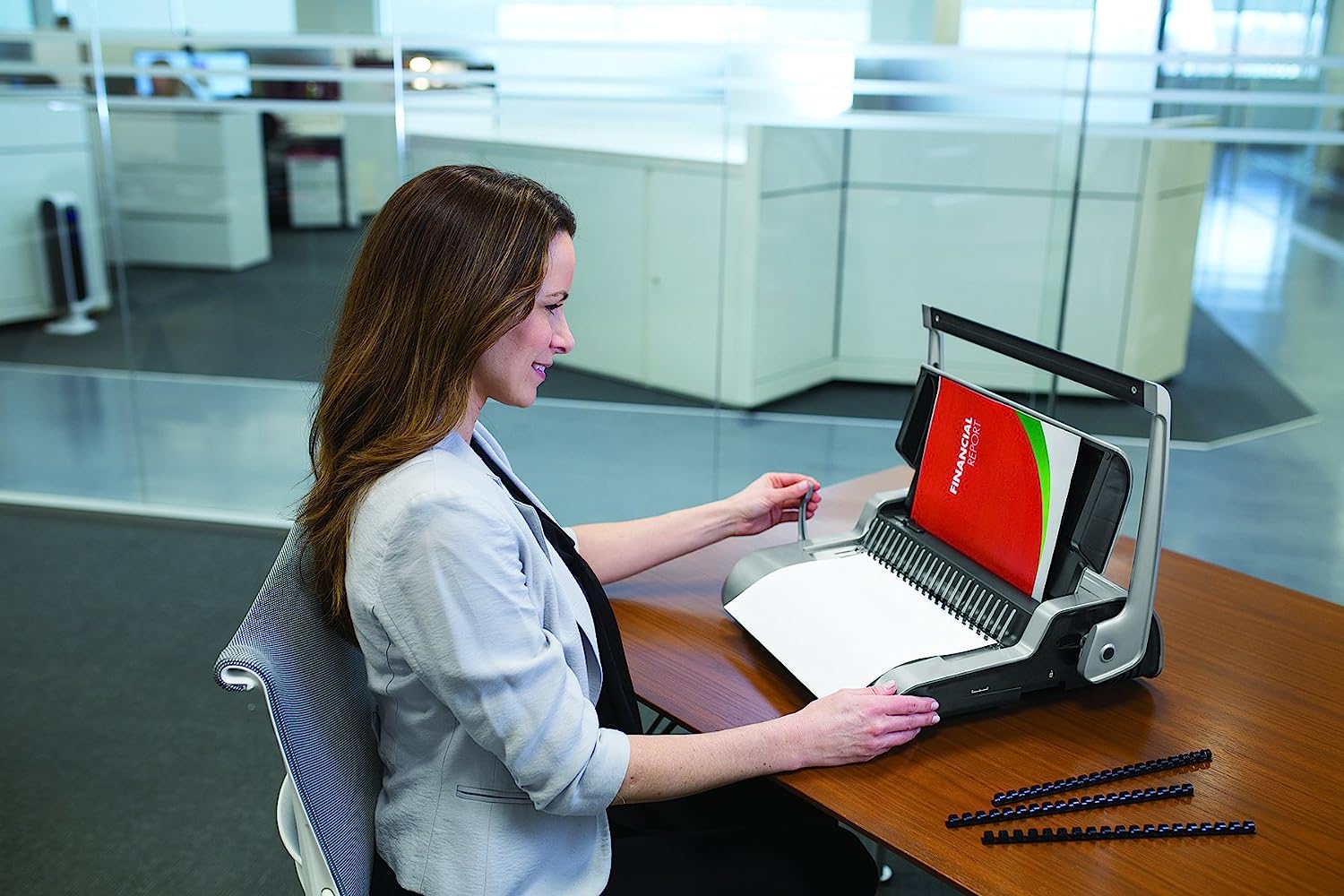 Designed for the binding needs of medium to large offices, this manual comb binding machine offers the ideal blend of performance and style. This machine manually punches up to 25 sheets at a time and binds up to 500 sheets with a 2" comb. Vertical document-loading ensures accurate punch alignment. Adjustable edge guide centers documents with ease. Efficient design allows you to punch and bind in a continuous manner. Quasar Plus Manual Comb Binding Machine also features a built-in comb storage tray with document measurement device for added convenience and quick setup. Machine also includes a binding starter pack.