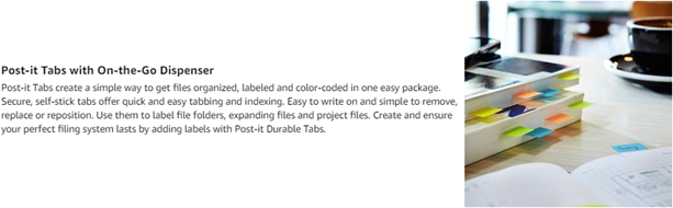 Post it Tabs in 1 inch size create necessary order by easily organizing planners and calendars into sections. Solid color bars give you flexibility to organize by color. Tabs are durable, you can write on them, and reposition as needed. They are also great for planners, binders and file folders. Tabs stick securely and remove cleanly. Aqua, Yellow, Pink and Violet. Contains 22 tabs/color and 88 tabs/on the go dispenser.