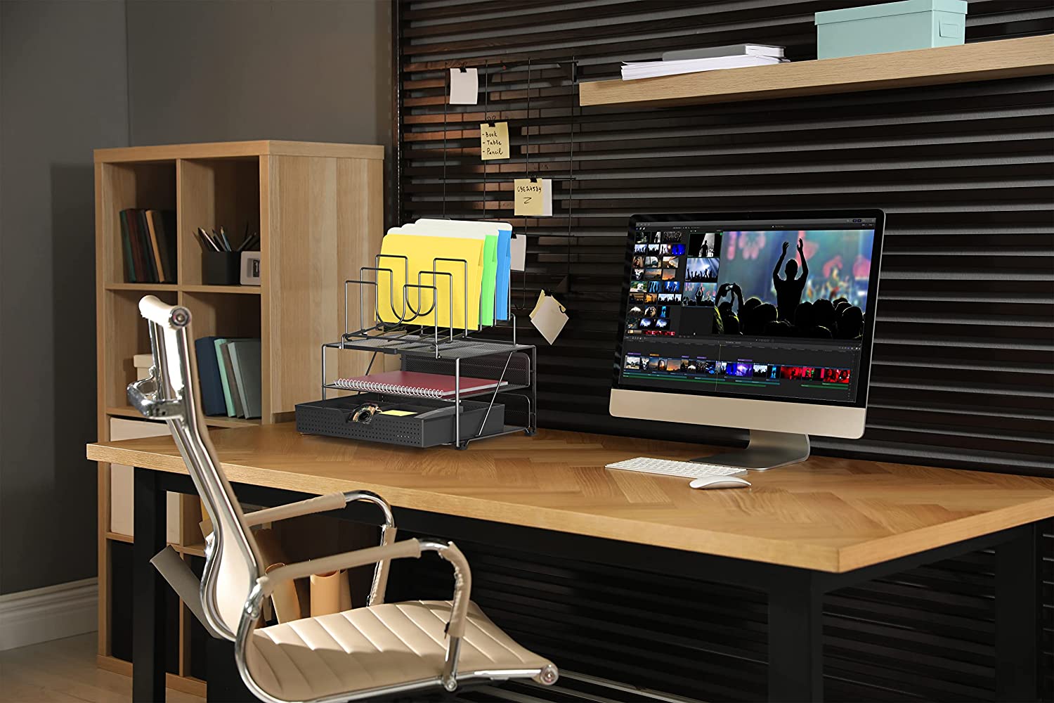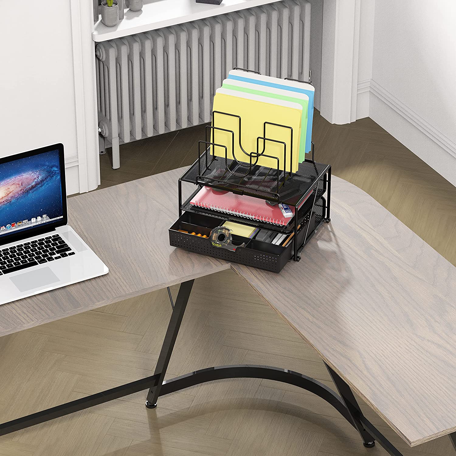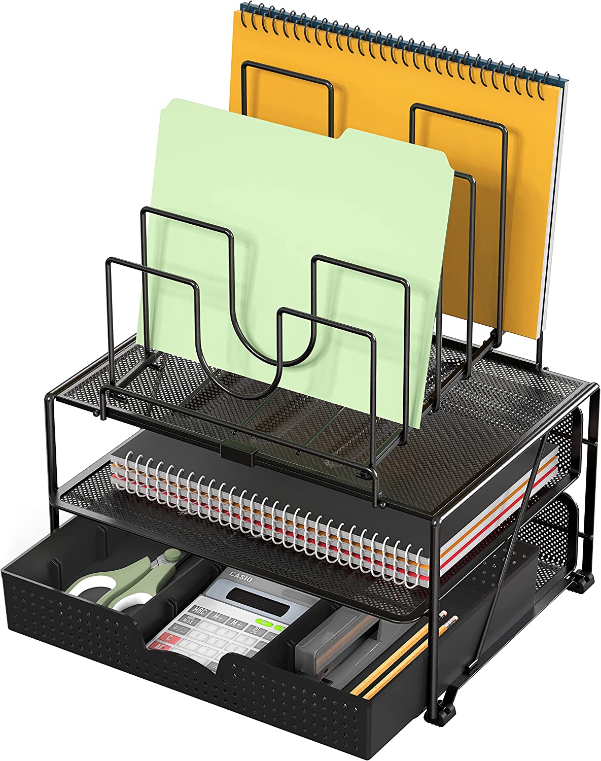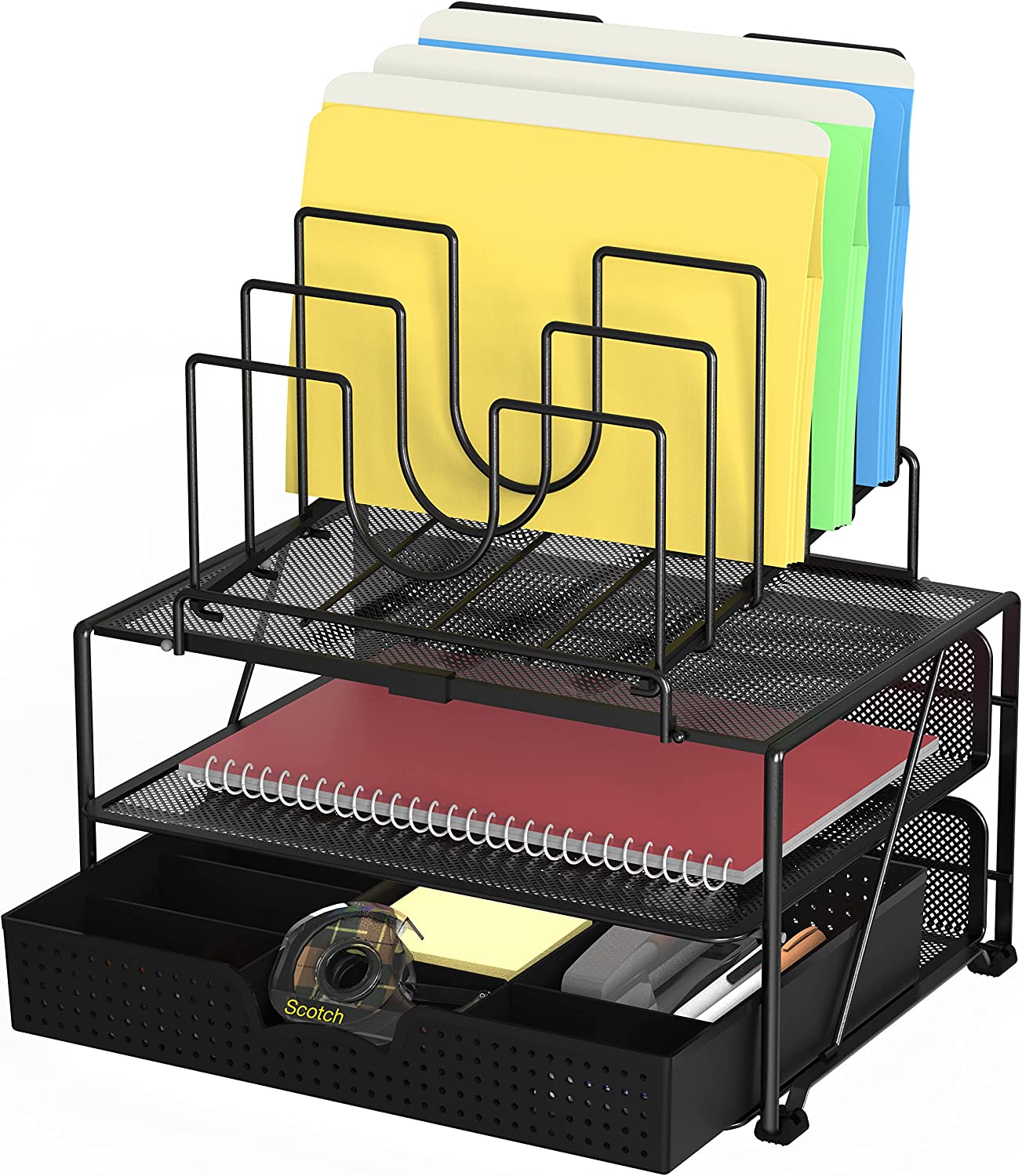 Desk File Organizer with Drawer Anyyuk Office Supplies Organizer with Double Tray and 5 Upright File Folder Holders Sections Desktop Organizer for Workspace Home Office School, Black