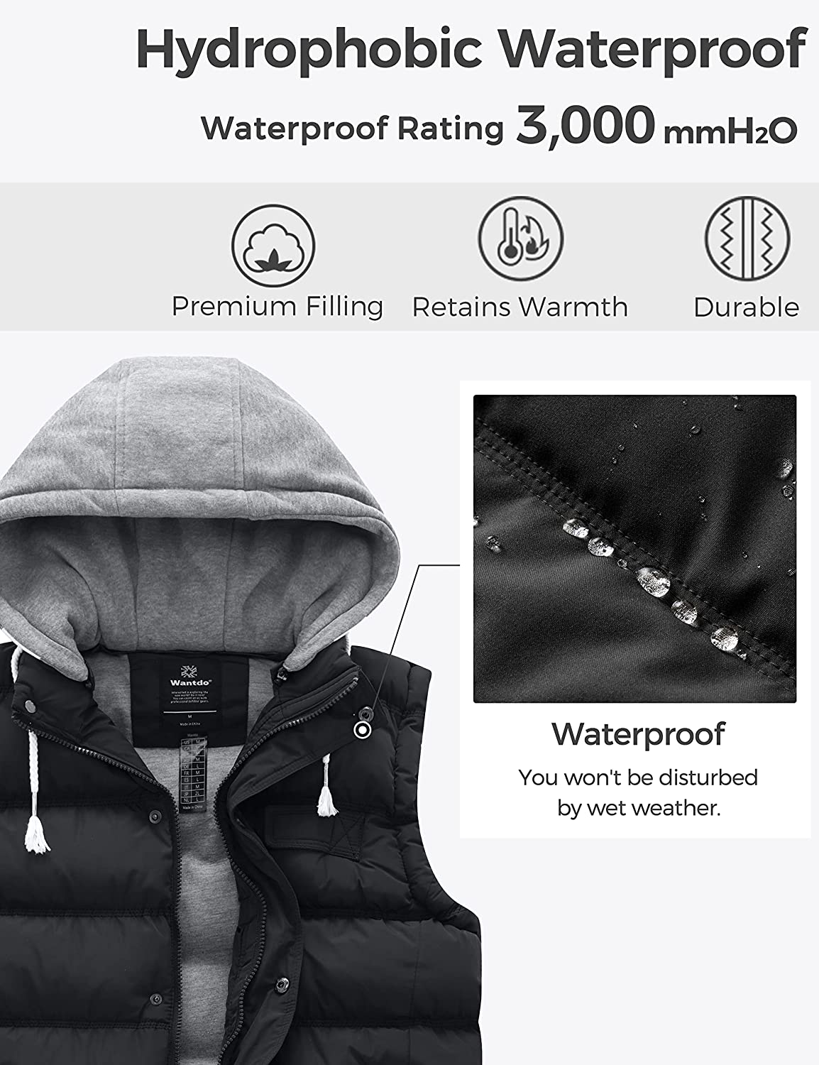 • Outerwear That Keeps You Dry - Don't let a slight drizzle ruin your day out. This women's puffer vest with hood has a DWR finish that keeps your body warm and dry under light rain for about 2-3 hours.