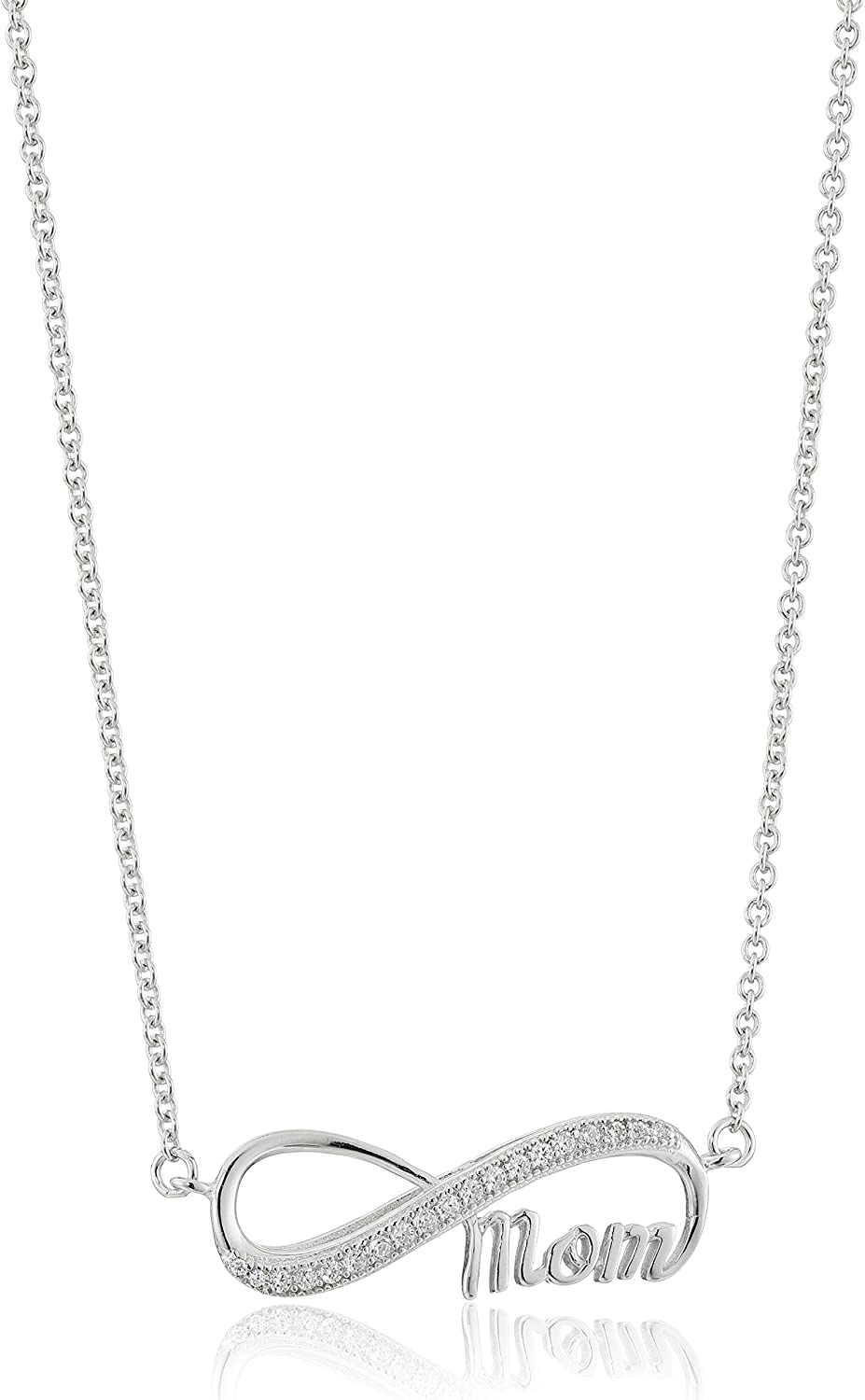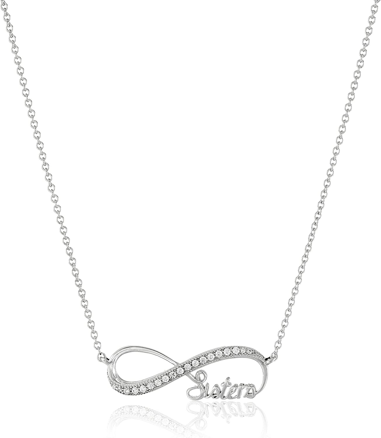 Gold plated Sterling silver necklace featuring infinity-shaped sisters pendant featuring prong-set cubic zirconia rounds and "Sisters" inscription