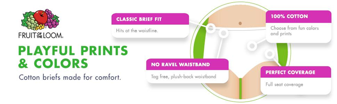 Our girls' brief is designed with breathable 100 percent cotton fabric, a plush, ravel-free waistband, and soft fabric covered legs. The waistband sits just below the belly button and has a lower cut leg for a more classic fitting panty. This assortment includes a combination of super cute prints and fashionable solids so you are covered for whatever you need. And since there are no irritating tags, this brief is not only cute, but the ultimate in comfort