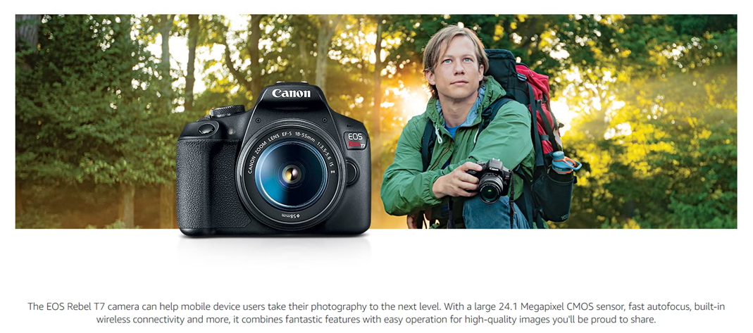 The camera with the quality your photos deserve, the EOS Rebel T7 can be ideal for smartphone or digital point-and-shoot camera users looking to step up their imaging game. It's equipped with a 24.1 Megapixel CMOS image sensor for highly detailed, vibrant photos and videos even in low light. Whether you're out on an adventure Hike or snapping candid's of your friends during a late night out, the EOS Rebel T7 can help you take photos you'll want to show off. Built-in Wi-Fi and NFC connectivity makes it easy to share, print, or get your favorite pictures up on select social media sites for your friends, family and the world to see. If you're new to DSLRs, scene intelligent auto mode can conveniently and automatically adjust the camera's settings to suit your subject. Easy to use and simple to share with, the EOS Rebel T7 delivers high image quality that's sure to catch the audience's eye. Working Humidity Range: 85% or less.