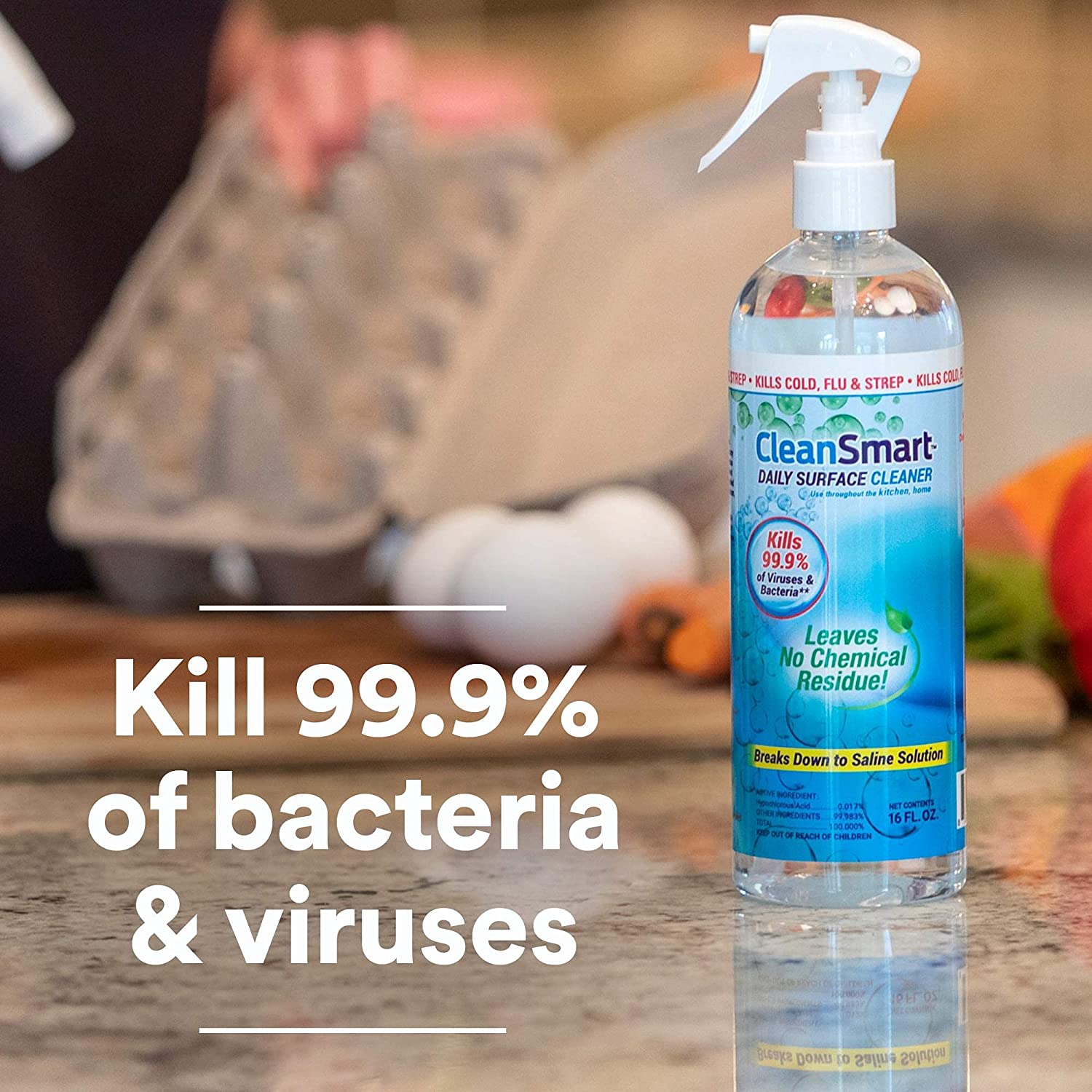 KILLS 99.9% OF VIRUSES AND GERMS during household cleaning. Safe to spray eating surfaces, no rinsing