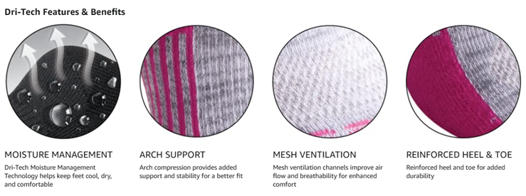 • Moisture wicking fibers keep feet dry with ventilation channels engineered for air circulation and moisture control