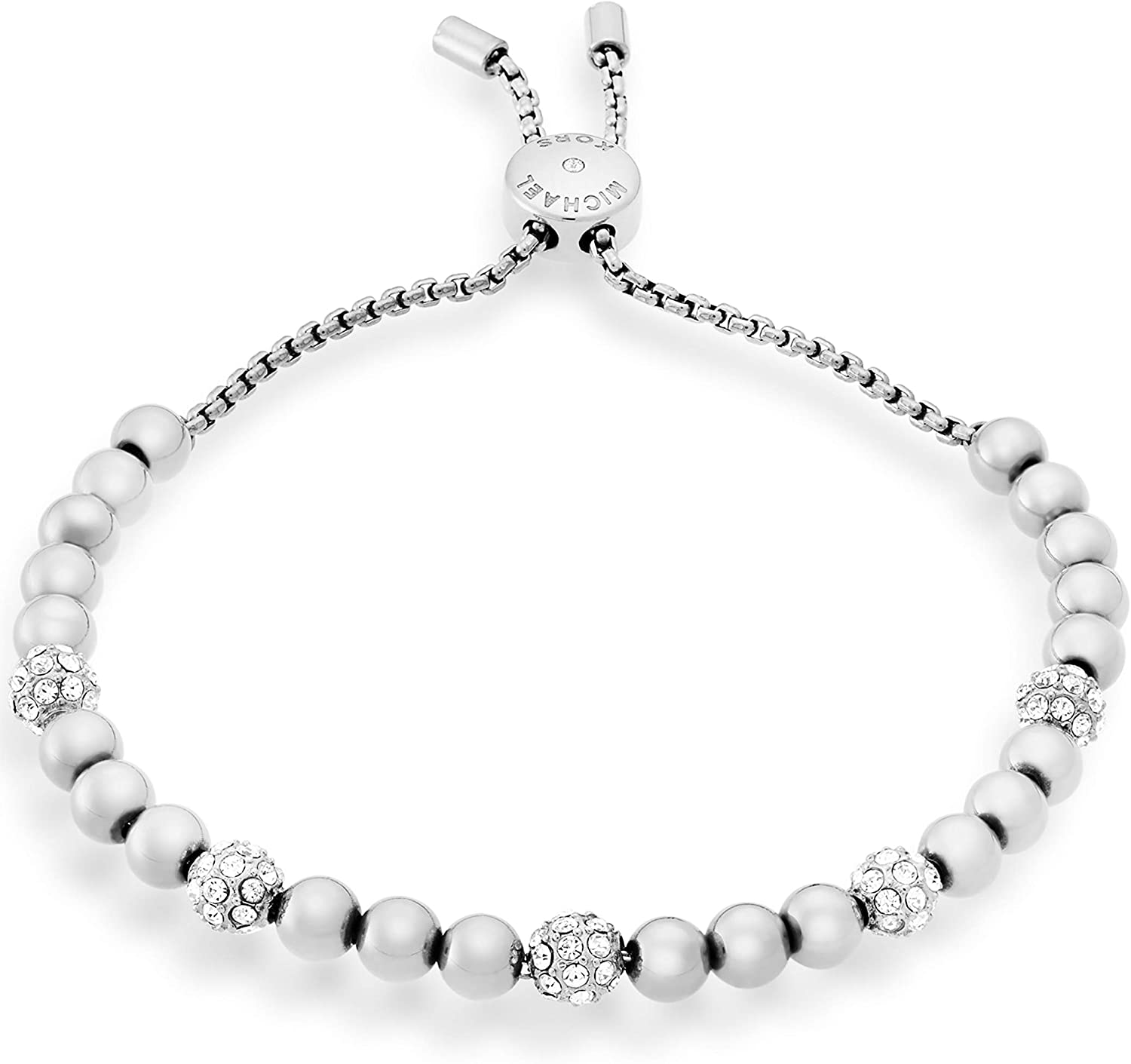 Be charmingly chic in this silver-tone Michael Kors Jewelry beaded bracelet; Four pavé crystal beads add sparkle, and the slider clasp is finished with the MK logo