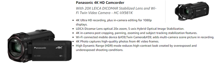 Equipped with a 20x Optical Zoom LEICA Dicomar lens and 5-axis Hybrid Optical Image Stabilization function, the Panasonic 4K Ultra HD Camcorder HC-VX981K brings simplicity to the 4K recording experience. It adds in-camera editing solutions such as cropping, panning, zooming and subject tracking stabilization that can enable anyone to capture and produce content without the need for complex software. An innovative HDR mode captures clear shots with excellent detail in both bright and dark areas. The Wi-Fi functions make the camcorder competent in a variety of tasks: remote shooting and view via the Panasonic smartphone app, picture-in-picture style video recording with your smartphone as a sub camera. For those without a 4K display option, the HC-VX981K offers in-camera down sampling to 1080p displays for convenient playback. Connectivity technology: USB: 2.0 Hi-Speed, HDMI: Micro, Wi-Fi: IEEE 802.11b/g/n. Motion Image 4K: 8.29 megapixels [16:9], Full-HD: 6.10 megapixels [16:9] (Level Shot Function OFF or Normal).