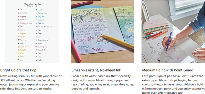 The Paper Mate Flair Pens will have you loving writing. Each of the pens has Point Guard to prevent the tip from fraying, so you always produce neat lines even after repeated use. Featuring quick drying, water-based ink that resists smearing, these colored pens always leave a great impression. The ink is also specially designed so that it won't bleed through paper. The intense black ink in these medium-point pens makes it easy to express yourself with flair. Every stroke produces bold, clean lines that make them perfect drawing pens, pens for journaling, and office supplies.