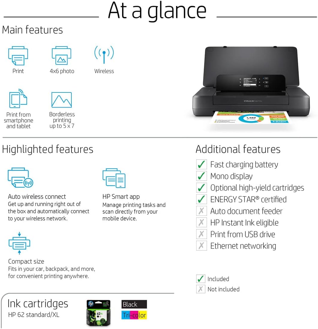 Make the world your office with powerful portable printing—no network necessary. This quick, quiet printer delivers more pages per cartridge and has a long- lasting battery life. Ideal for mobile professionals and telecommuters who need a high-quality, reliable, portable printer they can take virtually anywhere. Easy portable printing wherever you need it: Simply print from your laptop or mobile devices wirelessly, with or without a router. This durable, compact printer fits in your car, backpack, and more, for convenient printing anywhere. Start printing in minutes. HP Auto Wireless Connect makes setup easy. Lead the way with fast, easy mobile printing. Reduce charging interruptions with a long-lasting battery. Stay productive with a large and easy-to-use control panel. Set the pace for success wherever you go. Keep moving through the day with fast print speeds. Get the highest page yields of any other in-class printer, using Original HP cartridges. High-powered quality and reliability: Power through the workday. Charge from home, in your car or office, and more. Get high-quality prints time after time with a printer designed and built to be reliable. Minimize disruptions with premium design and quiet performance. Impress clients, without noisy interruptions. Plug in your AC power source to charge within 90 minutes while the printer is off, with HP Fast Charge.