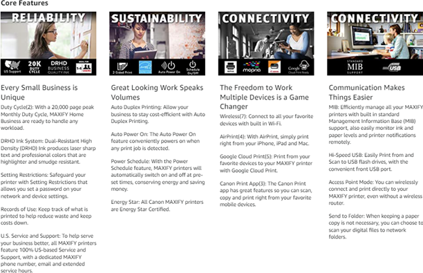 | 1. Document print speeds are the averages of ESAT in Office Category Test for the default simplex mode, ISO/IEC 24734. Document print speeds are the averages of FPOT in Office Category Test for the default simplex mode, ISO/IEC17629:2014. Print speed may vary. During successive printing, the printer may slow down the operation to prevent the internal temperature from rising. depending on system configuration, interface, software, document complexity, print mode, page coverage, type of paper used etc. Copy speeds are the average of sFCOT and sESAT, ISO/IEC 29183. Copy speed may vary depending on document complexity, copy mode, page coverage, type of paper used etc. and does not take into account warming up time. When scanning or copying a certain volume of documents (approx. 150 sheets in default settings) continuously from the ADF,the printer may switch to 'waiting mode' in which paper feeding stops for several tens of seconds after each scan to prohibit overheating the ADF. See the websitefor additional details. 2. Duty Cycle is defined as the maximum number of printed pages for a single peak month. 3. Requires an Internet connection and the Canon PRINT Inkjet/SELPHY app, available for free on the App Store and at Google Play. Compatible with iPad, iPhone 3GS or later, and iPod touch 3rd generation or later devices running iOS 7.0 or later, and Android mobile devices running Android 2.3.3 or later. Your device must be connected to the same working network with wireless 802.11 b/g/n capability as your printer. For users of compatible Apple mobile devices, document printing requires Apple AirPrint, which requires an AirPrint-enabled printer connected to the same network as your iOS device. A printer connected to the USB port of your Mac, PC, AirPort Base station, or Time Capsule is not supported. 4. AirPrint functionality requires an iPad, iPhone 3GS or later, or iPod touch 3rd generation or later device running iOS 4.2 or later, and an AirPrint-enabled printer connected to the same network as your iOS device. A printer connected to the USB port of your Mac, PC, AirPort Base station, or Time Capsule is not supported. 5. Requires an Internet connection and Google account. Subject to Google Terms of Service. Certain exceptions may apply. | 6. Requires Android mobile device with Android 4.4 operating system or later with the Mopria Print Service pre-loaded with that device and the compatible PIXMA/MAXIFY printer on the same wireless network. The Mopria experience is also available on Android 4.4 mobile devices with a download of the Mopria Print Service from Google Play. 7. Wireless printing requires a working network with wireless 802.11b/g or n capability. Wireless performance may vary based on terrain and distance between the printer and wireless network clients. 8. Resolution may vary based on printer driver setting. Color ink droplets can be placed with a horizontal pitch of 1/600 inch at minimum. 9. Scan to Concur requires a valid Concur account. Scanned files have a 10MB volume limit, with a 100 page maximum. Multiscan not available, receipts uploaded to Concur Cloud. 10. Optical resolution is a measure of maximum hardware sampling resolution, based on ISO 14473 standard. 11. The Public Switched Telephone Network currently supports fax modem speeds of 28.8 Kbps or lower, depending on telephone line conditions. Sending and receiving fax machines need to conform to ITU-T v.34 guidelines. 12. Black and white document fax transmission speed is based on default setting using ITU-T No.1 chart. Color document fax transmission speed is based on default setting using Canon Color Fax Test Sheet. Actual transmission speed varies depending on document complexity, fax setting at receiving end, and line conditions etc. 13. Page count is based on ITU-T No.1 chart or Canon FAX Standard Chart No.1. The number of pages able to be kept in memory will vary based on remaining memory capacity and document complexity. 14. High Page Yield calculated when using Canon Genuine XL Ink Tanks. 15. Requires an Internet connection.16. Acoustic Noise is measured based on ISO7779 standard. | 17. Operation can only be guaranteed on a PC with factory-installed Windows 10, Windows 8.1, Windows 8, Windows 7, Windows Vista or XP. 18. Available from printer driver and fax driver only. XPS drive is not supported for Windows Server 2003 and 2003 R2. 19. Internet Connection required during software installation. 20. Some functions may not be available with these Operating Systems. Please refer to the manual or our website for full details. 21. Requires a Windows RT compatible device with Windows 10, Windows 8.1 or Windows 8 and the Canon Easy-PhotoPrint app for Windows RT available for free in the Windows Store. 22. PosterArtist Lite software v2.60.00 is compatible with 64/32 bit versions of Microsoft Windows 10, Windows 8.1, Windows 8, Windows 7 and Windows Vista, and only compatible with Canon PIXMA (released after July 2015), MAXIFY, imagePROGRAF and Océ printers. Minimum computer system requirements: Pentium4 2.4Ghz CPU or higher with 1GB RAM, 1024x768 pixel display and 5GB of system hard drive space. 23. Warranty programs are subject to certain conditions and restrictions. See the website for details. 24. Dimensions with letter (A4) paper installed. |