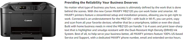 No matter what type of business you have, success is ultimately defined by the work that is done behind the scenes. You can work fast and smart with the Canon MAXIFY MB2120 Wireless Home Office All-in-One Printer, helping you to get through your workload. Specifically designed to help meet the needs of home-based businesses of 1-4 users, it delivers crisp, colorful prints of your business documents quickly, cost-effectively, and reliably. The MAXIFY MB2120 printer boasts a quick first printout time of 6 seconds with print speeds up to 19. 0 ipm (B&W)/13. 0 ipm (Color). Built for big jobs, it has a large 250 sheet paper cassette and 20, 000 page duty cycle. The efficient MAXIFY ink tanks deliver a high page yield from one set of ink and the Dual Resistant High Density (DRHD) ink system produces laser sharp text that is smudge and highlighter resistant. The entire MAXIFY lineup features built-in Wi-Fi and is fully compatible with the Canon PRINT app. This makes it easy to share and print information directly from your tablet and smartphone via select popular Cloud services. You can also easily scan directly to your mobile device. Best of all, the MB2120 printer is backed by 100% U. S. -based customer service and support.