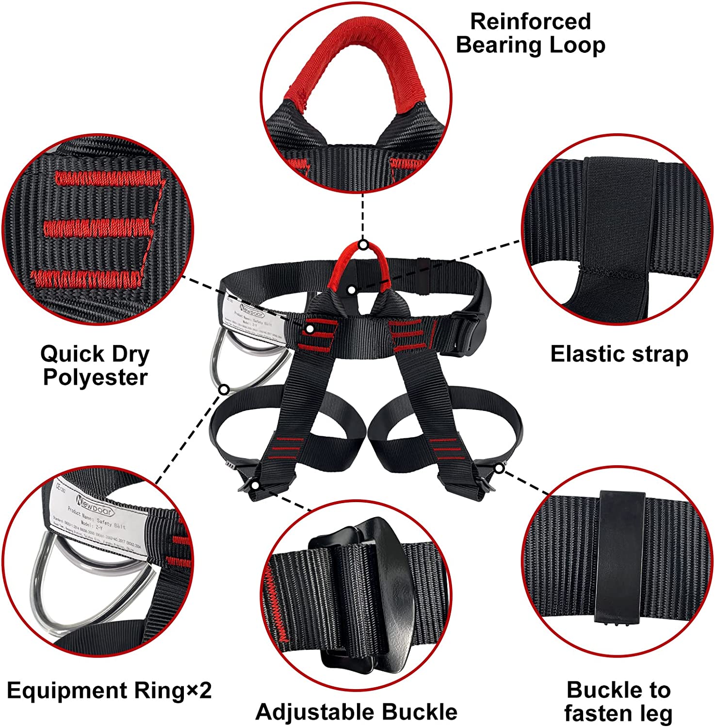 [TOOL RING]:There is 2 tool ring on the right side of the rock climbing Seat Belts, which makes it so easy to carry more climbing rope, chalk bag, belay device or other tree climbing gear rappelling gear. Two steel Adjustable Wait and Leg buckles allow waist belt to be adjusted and secured in a single movement.