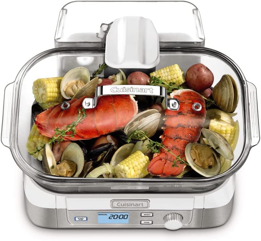 Consumers looking for a healthy way to cook will love Cuisinart's new Cook Fresh Digital Glass Steamer. A powerful steam system delivers steam from the top down, surrounding food to cook quickly and evenly. The 5-liter glass cooking pot is large enough for family-size portions of vegetables, fish, chicken, rice and more. And the steamer's 1-liter water tank conveniently lifts off to fill. Healthy cooking is today's biggest trend, and this new glass steamer from Cuisinart makes it quick and easy. Features: Powerful steam system|5L dishwasher-safe glass pot|5 preprogrammed food settings: seafood poultry grains vegetables and manual|60 minute countdown timer|LCD control panel|Audible alert|Start/Stop Pause & Reheat buttons|1L removable water tank|Stainless steel steaming tray flips to hold different types of food|Glass lid with stainless steel rim|Limited 3 year warranty|BPA-free