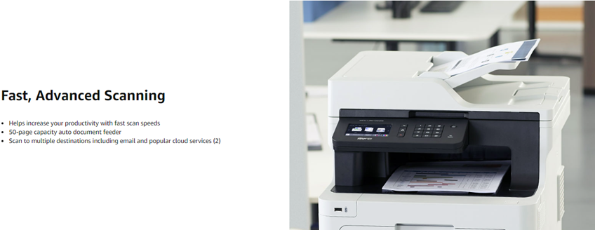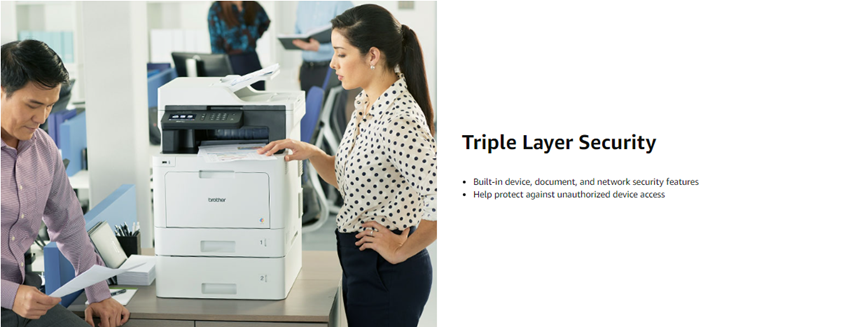 The Brother MFC-L8610CDW Color Laser All-in-One is a great choice for offices and small workgroups that need cost-efficient printing, easy scanning, secure document handling, and reliable, business-quality output. This color laser printer, copier, scanner, and fax machine was designed to enhance office productivity by delivering print speeds up to 33ppm(1) and scan speeds up to 29ipm. (6) The built-in scanning feature allows users to scan to popular destinations including e-mail, SharePoint, and business cloud services. (4) Connecting to the Brother MFC-L8610CDW is simple and convenient. Built-in wireless and Gigabit Ethernet network interfaces allow users to share the all-in-one. Plus, users can wirelessly print from a wide variety of mobile devices over a wireless network. An adjustable 3. 7″ Touchscreen display offers easy menu navigation and printing from and scanning to popular business Cloud services such as Google Drive, Dropbox, OneDrive, and more. (2) This Brother all-in-one offers a 50-page capacity automatic document feeder for copying, scanning and faxing multi-page documents. The adjustable 250-sheet capacity paper tray and 50-sheet capacity multipurpose tray make printing and copying simple. This office all-in-one can be upgraded to a 1, 050-sheet total capacity with optional trays. The MFC-L8610CDW is also Dash Replenishment enabled. This system allows the all-in-one to measure the toner level of your Genuine Brother Replacement Cartridges and automatically order replacements. This ensures you never run out of toner so that you can maintain the office efficiency you expect and require. (1)Based on one-sided printing. Change from default setting required. (2)Requires an Internet connection and an account with desired service. (3)Approximate cartridge yield in accordance with ISO/IEC 19798 (letter/A4). (4)Requires connection to a wireless network. (5)The mobile device must have NFC capability and run Android OS 4. 4 or later. (6)Scan speed measured with all advanced features turned off using LTR size test documents at 200dpi.