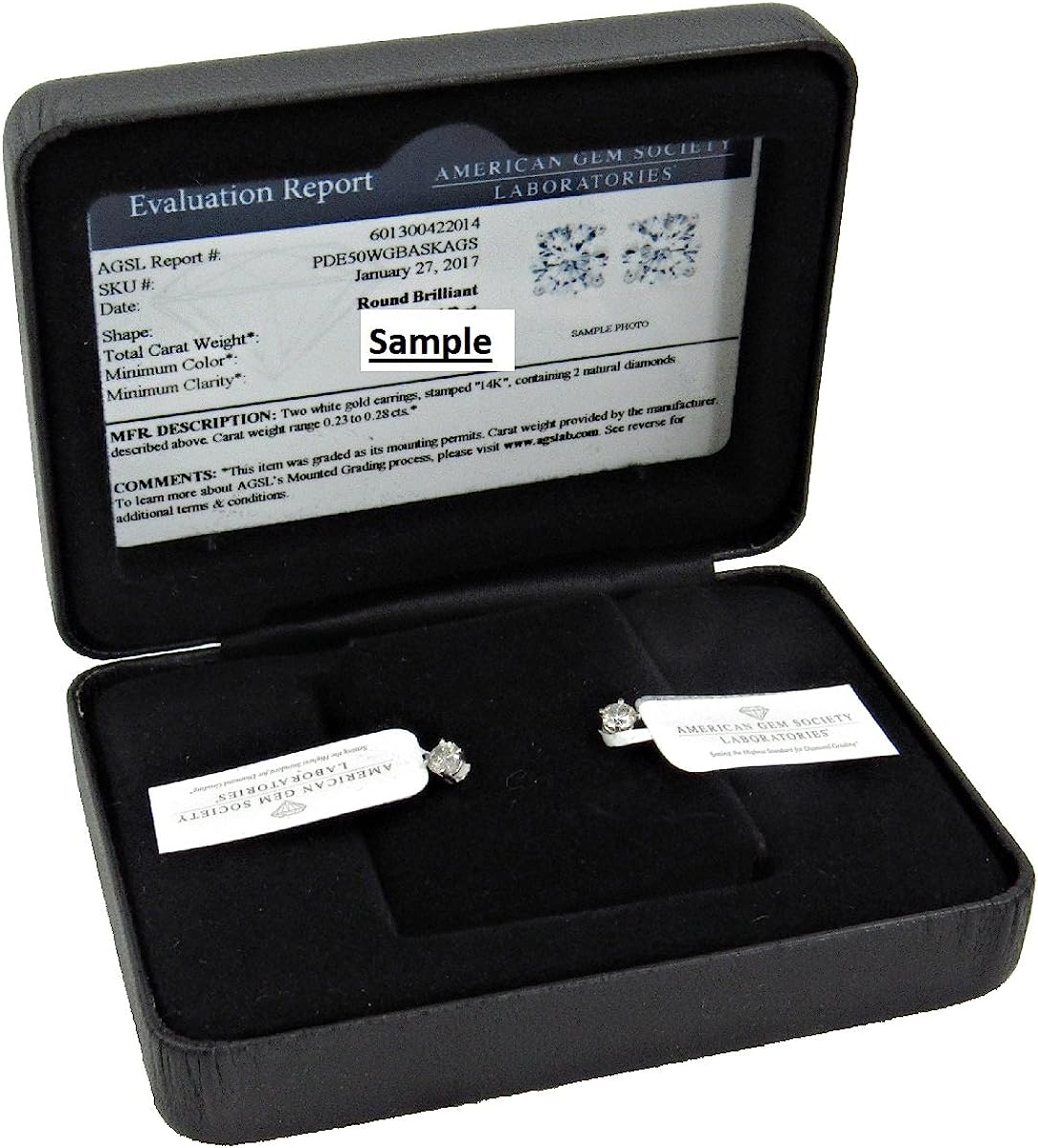 • AGS Certified diamonds. Each earring is tagged by AGS with the unique number of the included certificate. The Certificate can be verified on the American Gem Lab Society website