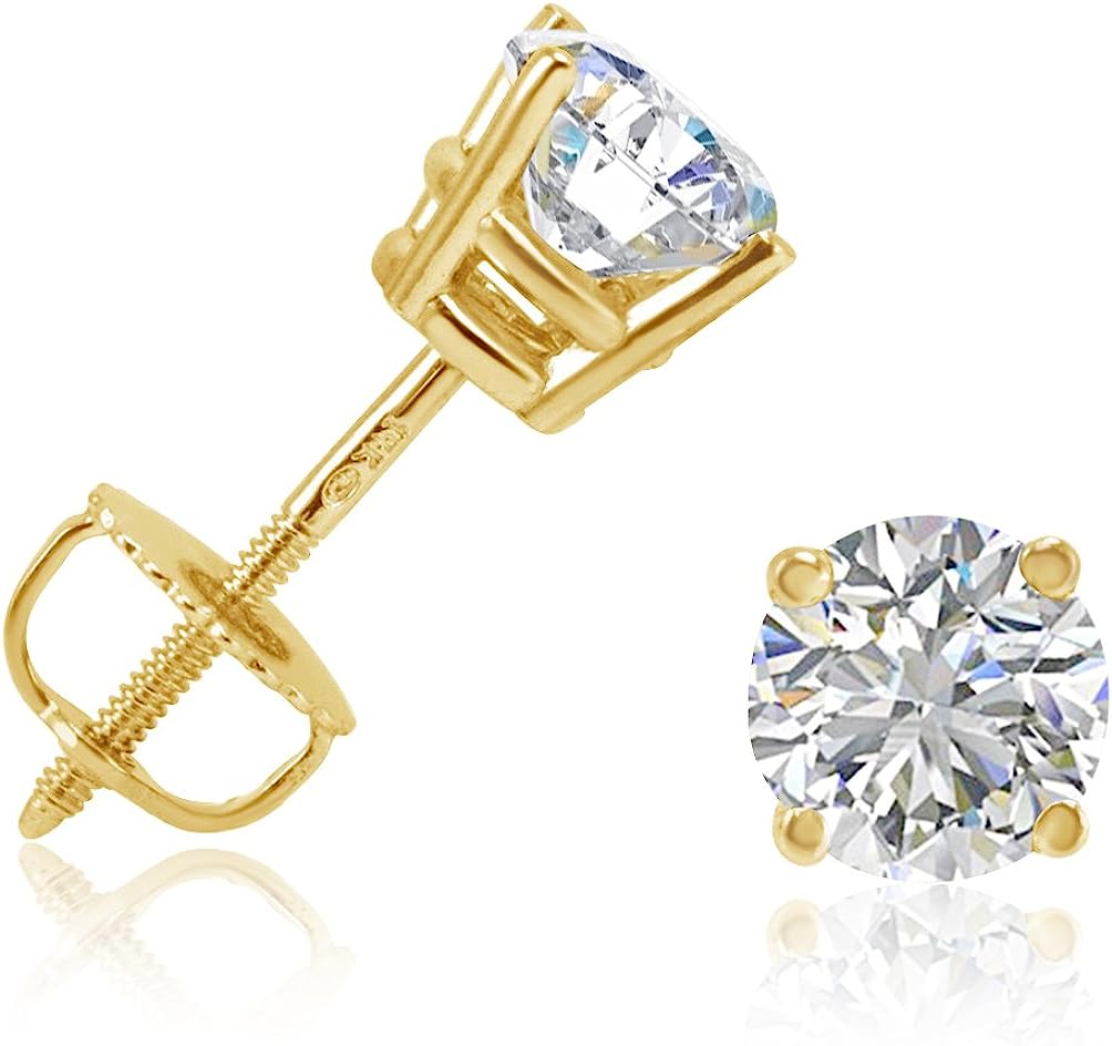 AGS Certified 1ct TW Round REAL Diamond Solitaire Stud Earrings in REAL 14K Yellow Gold or 14K White Gold with Screw Backs