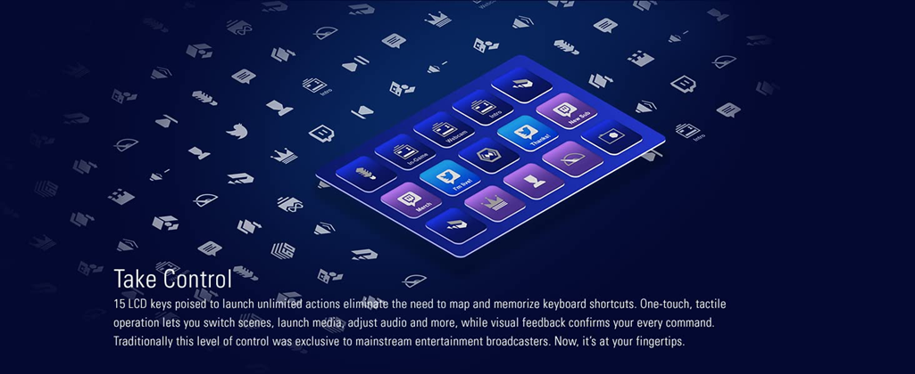 Stream Deck puts 15 LCD keys at your fingertips for ultimate studio control. Simply tap to switch scenes, launch media, tweet your feats and more. Personalize your keys with custom icons or choose from hundreds, and get visual feedback every time you execute a command. With Stream Deck, maximize your production value and focus on what matters most: Your audience. Interface Integrated USB 2.0 cable.