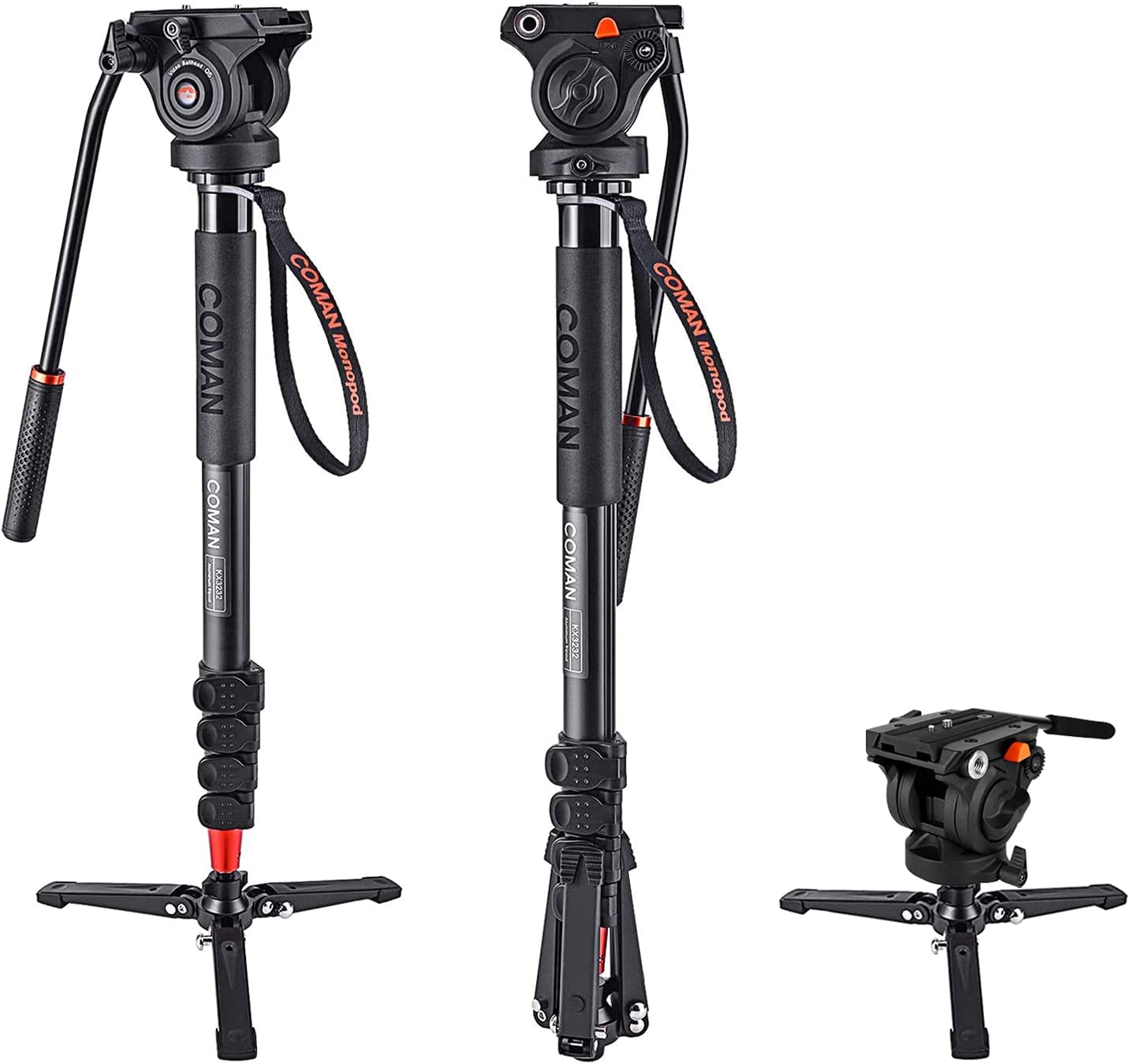 Monopod, COMAN KX3232 73.2 inch Professional Monopod Tripod Lightweight Aluminum Telescopic Camera Monopod with feet and Pan Tilt Fluid Head for DSLR Video Cameras