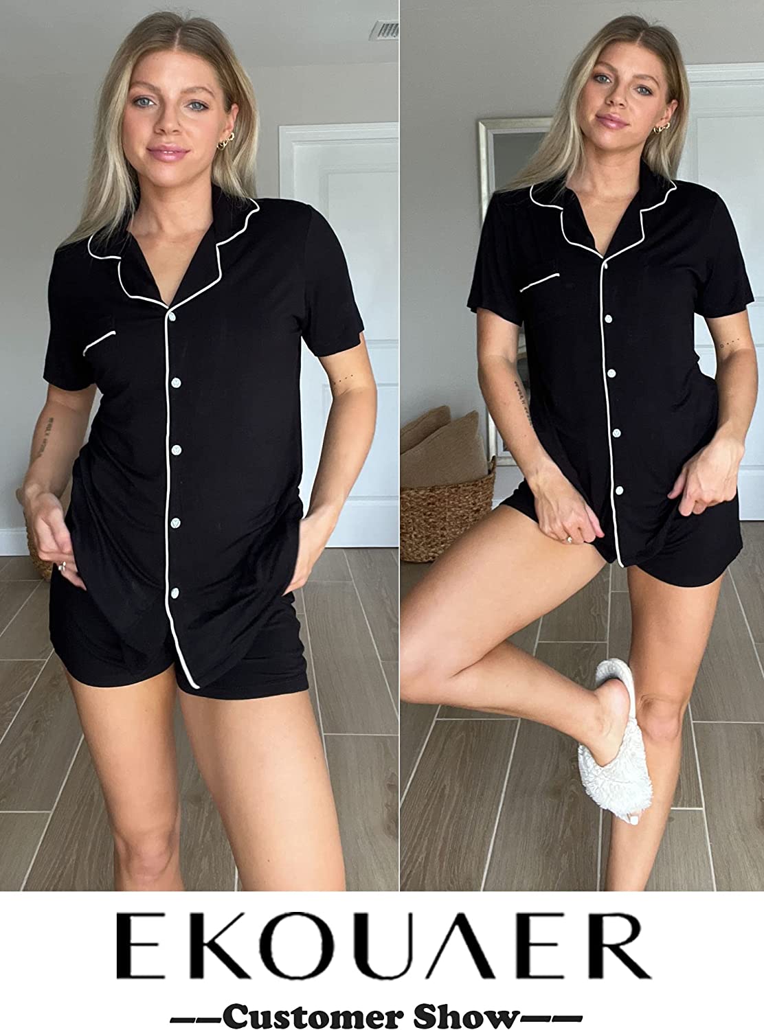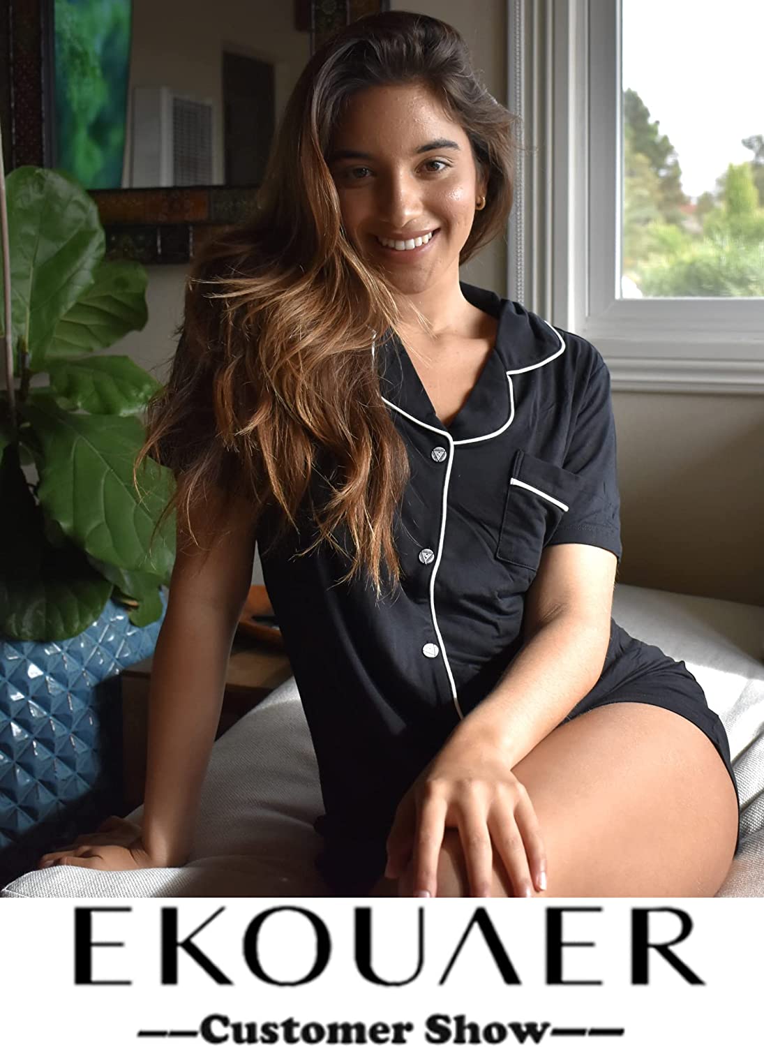 Ekouaer Women's Two-Piece Sleepwear Short Sleeve Pajama Set Pj Shorts XS-XLPajama set for women made from 95% Polyester/5% Spandex.Ultra soft and cozy Ekouaer sleepwear.Two piece pajamas set featuring short sleeve top and pj shorts for relaxed fit.This classic sleepwear with superior stitching and perfectly-lined hems. Breathable and Comfy sleepwear set.Ekouaer Pajamas Set Short Sleeve Sleepwear Womens Button Down Nightwear Soft Pj Lounge Sets XS-XXLPajam Top: Short sleeve sleepwear with button down pajama shirt hits at hip ,chest pocket with notch collar.Great for sleeping,casual wear or lounging around the house or yard all dayPajama Bottom: Pj lounge shorts with chiffon drawstring elastic waist.Summer pajama set is perfect for sleepwear,night wear or loungewear.This soft pajamas for women is the best sleepwear.Multiple colors pjs for women that suitable for the needs and preferences of different occasions.Two piece pajama set are perfect for pajama parties,bridal,dorm rooms,fun family pajamas pictures.And this short sleep set with high quality is also great for as a birthday,Valentine's Day,Christmas,New Year,Wedding and any other holiday gift set for your mom,wife,daughter and friendsEkouaer Sleepwear Short Sleeve Soft Cozy Pajama Set Silk Sleeping WearEco-friendly fabric:Body: 95% Polyester/5% Spandex.Easy fit and lightweightTwo-piece sleep pajama set featuring short sleeve top and boxer shortsTop: button-down with notch collar ,chest pocket with Ekouaer logo embroidery,and chiffon trimBottom: Short pants featured Elastic waist with chiffon drawstringMachine washable. To prevent wrinkles, promptly remove from dryerOur size are standard US size,please just choose your normal sleepwear size.