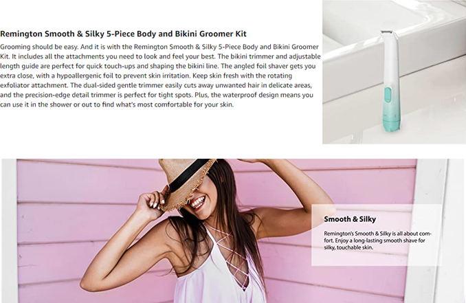 Grooming should be easy. And it is with the Remington Smooth & Silky 5-Piece Body and Bikini Groomer Kit. It includes all the attachments you need to look and feel your best. The bikini trimmer and adjustable length guide are perfect for quick touch-ups and shaping the bikini line. The angled foil shaver gets you extra close, with a hypoallergenic foil to prevent skin irritation. Keep skin fresh with the rotating exfoliator attachment. The dual-sided gentle trimmer easily cuts away unwanted hair in delicate areas, and the precision-edge detail trimmer is perfect for tight spots. Plus, the waterproof design means you can use it in the shower or out to find what's most comfortable for your skin. 16 Hour Recharge Time.