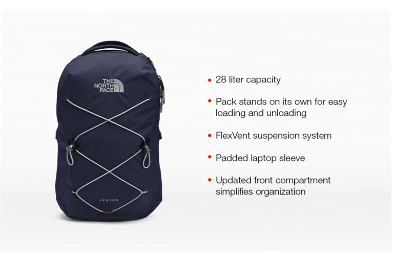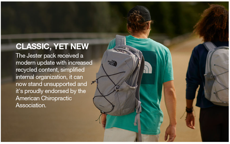 • CAMPUS READY. Our much-loved Jester pack has received a modern update: we've increased recycled content, simplified internal organization and it can now stand unsupported. Oh, and it's proudly endorsed by the American Chiropractic Association.