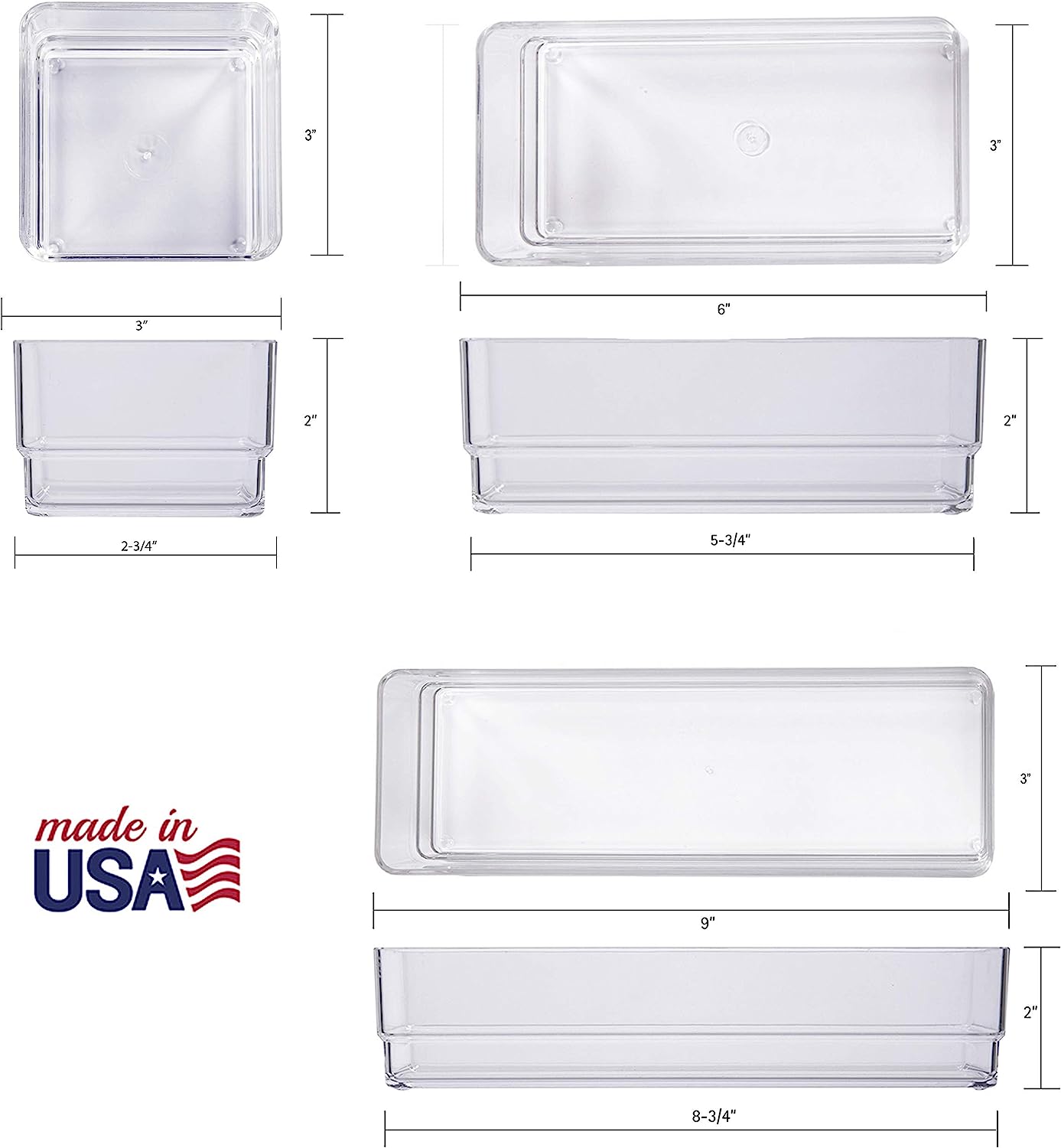 Time to get your drawers organized! With many applications and configurations, these individual organizers can fit side by side to sort daily essentials in your drawers! Each container easily stacks for multiple layers of storage. Great for deep drawers! Purchase additional sizes to customize your organizational needs. Create modular sets to organize drawers in your entire house. Clear, break-resistant plastic fits in any décor. No assembly required. Cleans easily with mild soap and warm water. Made in USA.