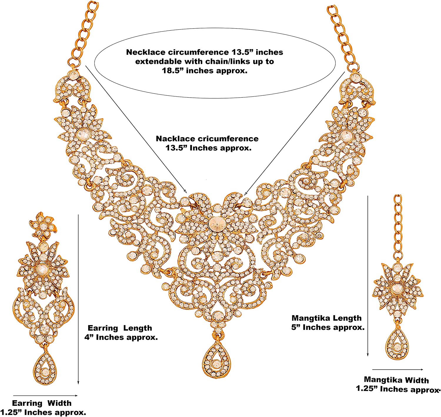 Touchstone Indian Bollywood traditional royal look attractive filigree carving white Rhinestone grand bridal designer jewelry necklace set for women in antique gold tone EXTRA LONG EARRINGS. Length 4 inches SPECIFICATIONS : Necklace circumference 8 inches with adjustable/extendable soft tassel. Earring weight (single) 18 gms. Earring length 4 inches. Earring width 1.25 inches. This is in a special dark gold plating to recreate the look of antique jewelry.