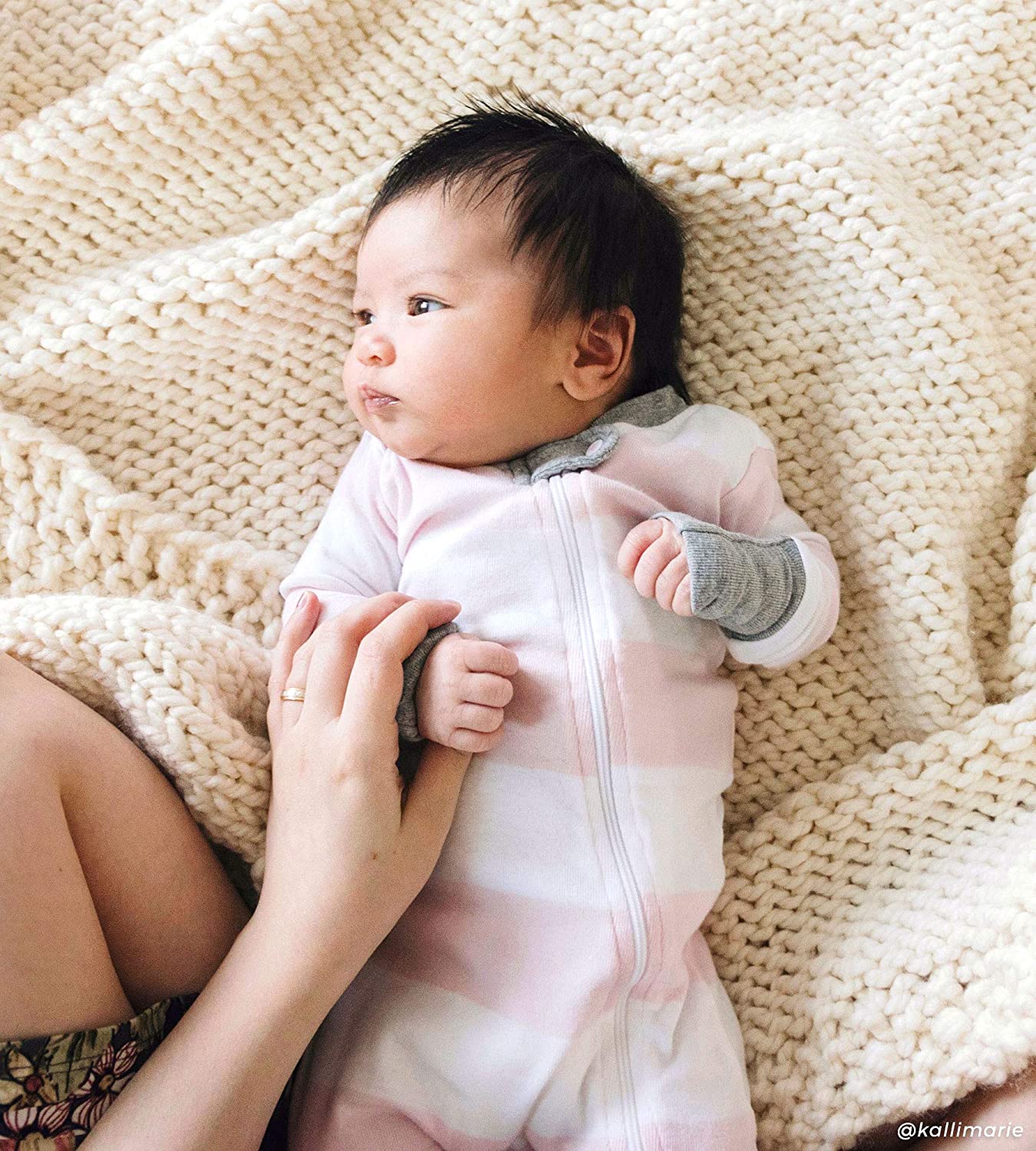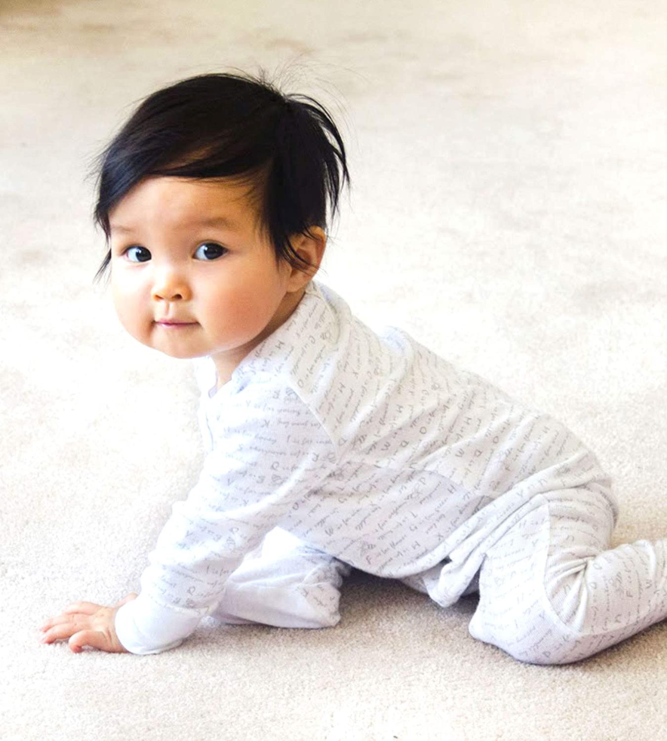 - Diagonal zip front for easy diaper changes & snap tab at neck to protect delicate skin