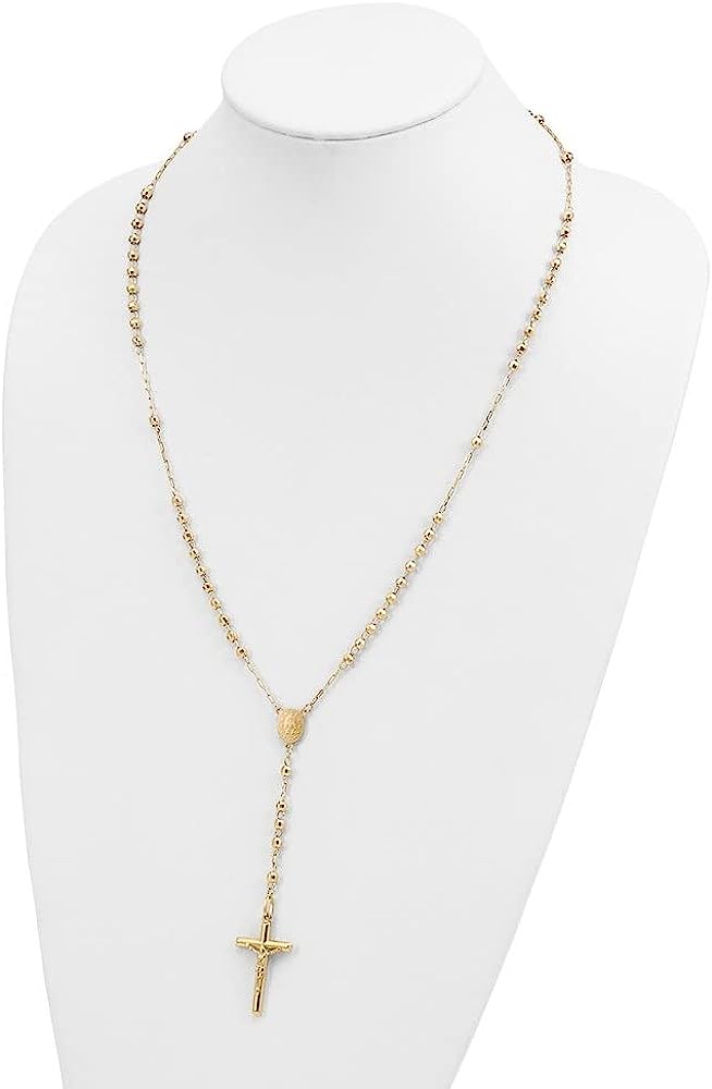 PREMIUM QUALITY - 14k Yellow Gold Diamond cut Y Virgin Mary Beaded Rosary Cross Pendant Necklace for Women Elegantly Crafted in Highest Quality for Luxurious Shine and Feel