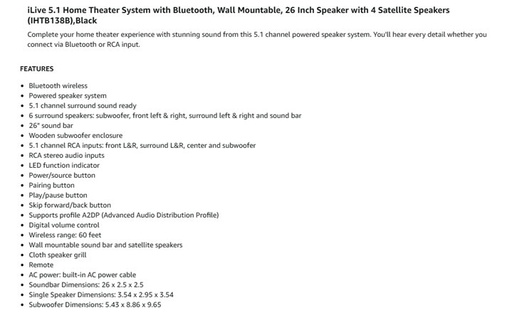 Complete your home theater experience with stunning sound from this 5. 1 channel powered speaker system. You'll hear every detail whether you connect via Bluetooth or RCA input. This home theater system features 6 surround speakers: subwoofer, front left and right, surround left and right and a 26 inch sound bar. With a wireless range of 60 feet, this system includes a remote control, 3. 5mm to RCA audio cable, 3 RCA stereo audio cables, and user's guide. Sound bar and satellite speakers are wall mountable (hardware not included). iLive products offer exciting, innovative features with a quality and affordability that you can depend on. AC power: built-in AC power cable,Soundbar Dimensions: 26 x 2.5 x 2.5,Single Speaker Dimensions: 3.54 x 2.95 x 3.54,Subwoofer Dimensions: 5.43 x 8.86 x 9.65,Cloth speaker grill,LED function indicator.